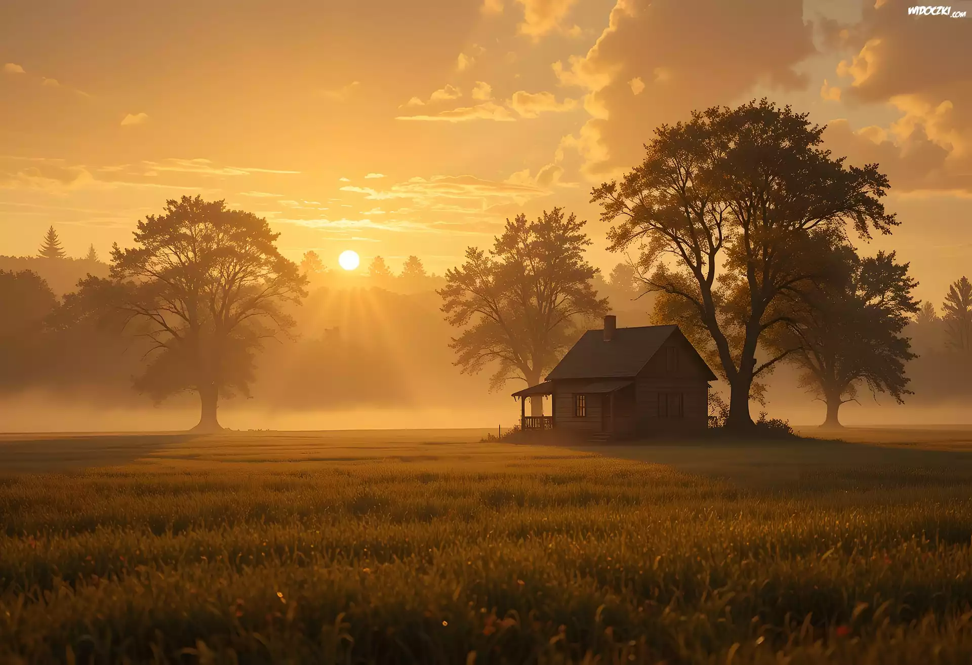 Dom, Drzewa, Łąka, Mgła, Zachód słońca