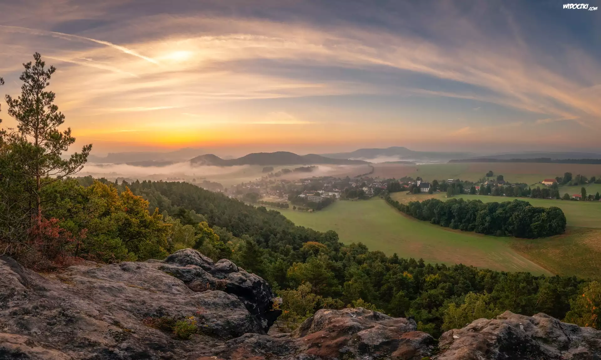Zdjęcia, Niemcy, Saska Szwajcaria, Góry Połabskie, Skały, Las, Drzewa, Domy Mgła, Wschód słońca