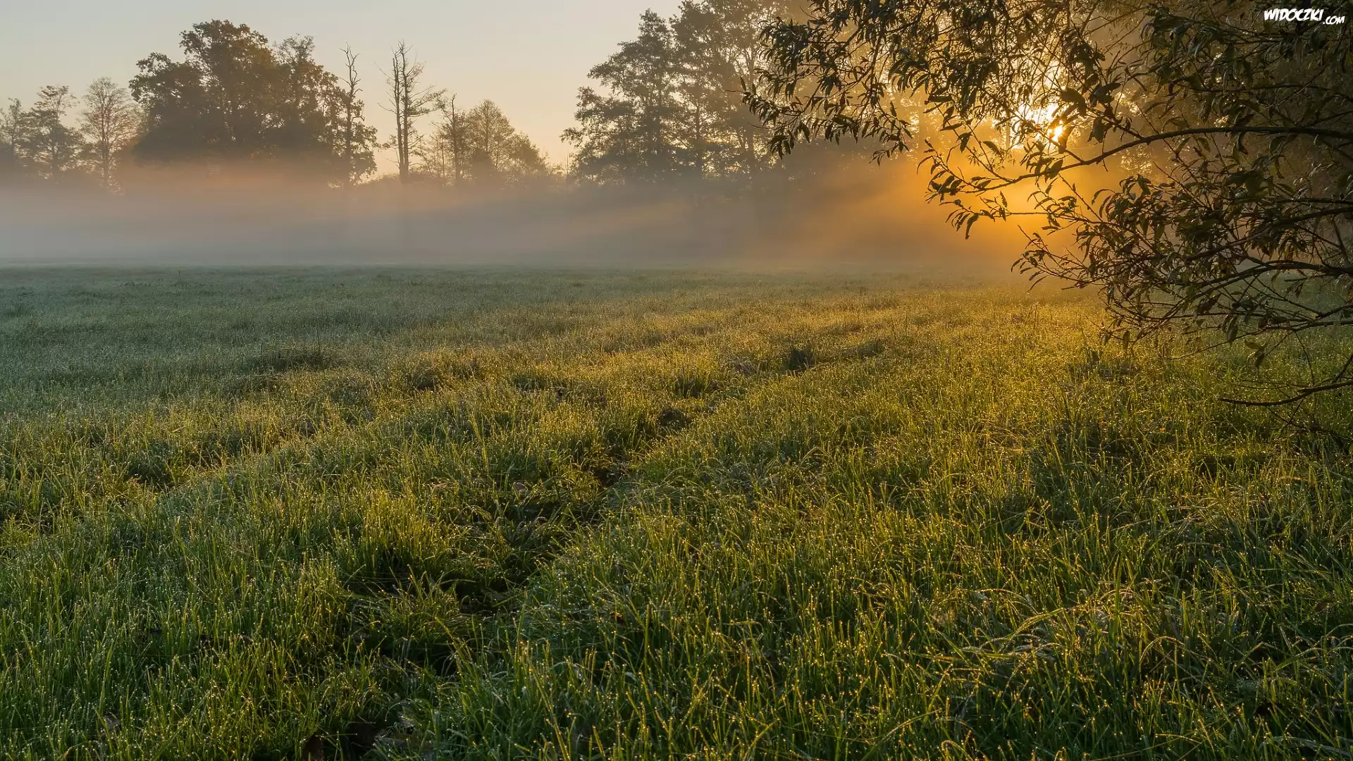 Zdjęcia, Łąka, Trawa, Drzewa, Mgła, Poranek