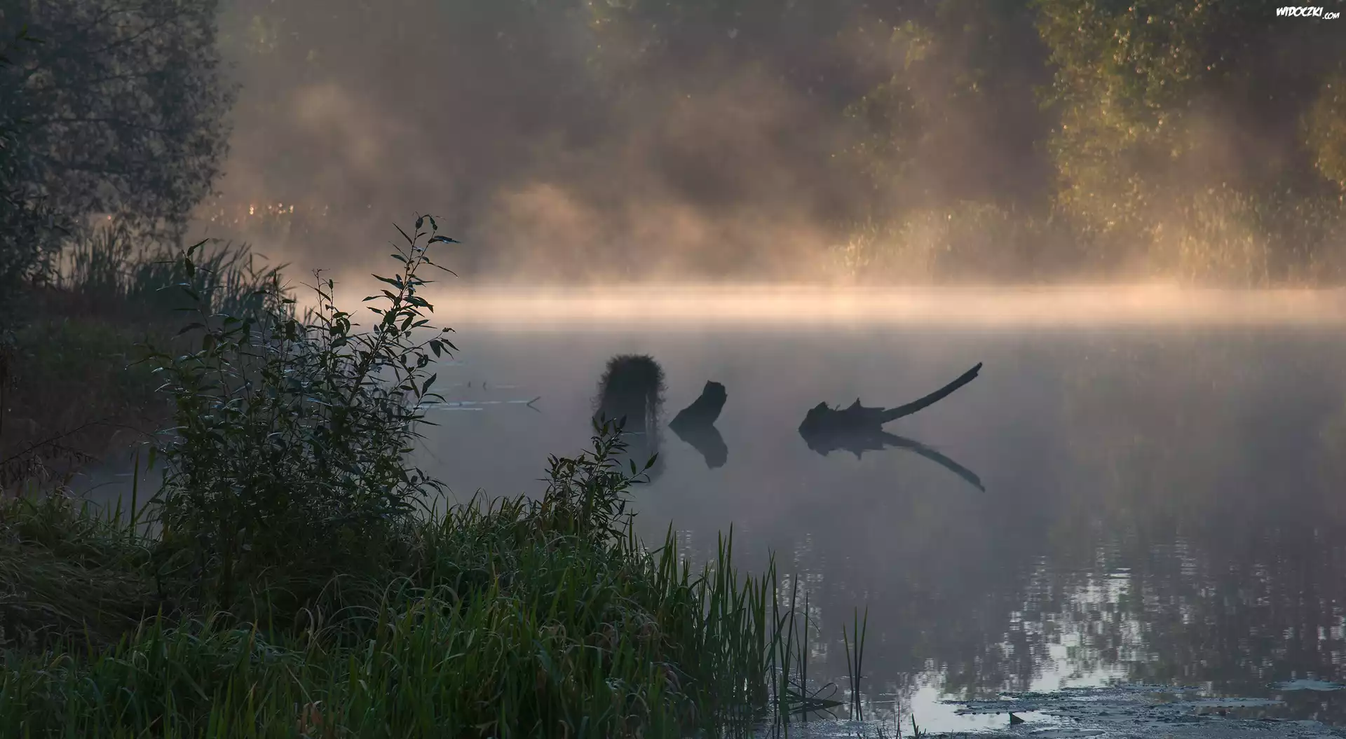 Zdjęcia, Mgła, Drzewa, Rośliny, Trawa, Rzeka