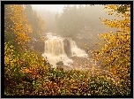 Jesień, Rzeka, Wodospad, Mgła, Drzewa, Skały, Roslinność