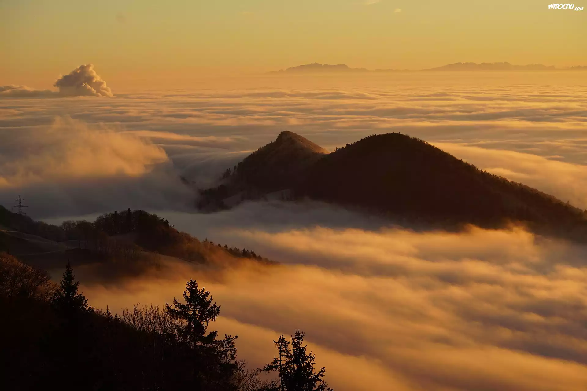 Mgła, Chmury, Drzewa, Wzgórza, Góry