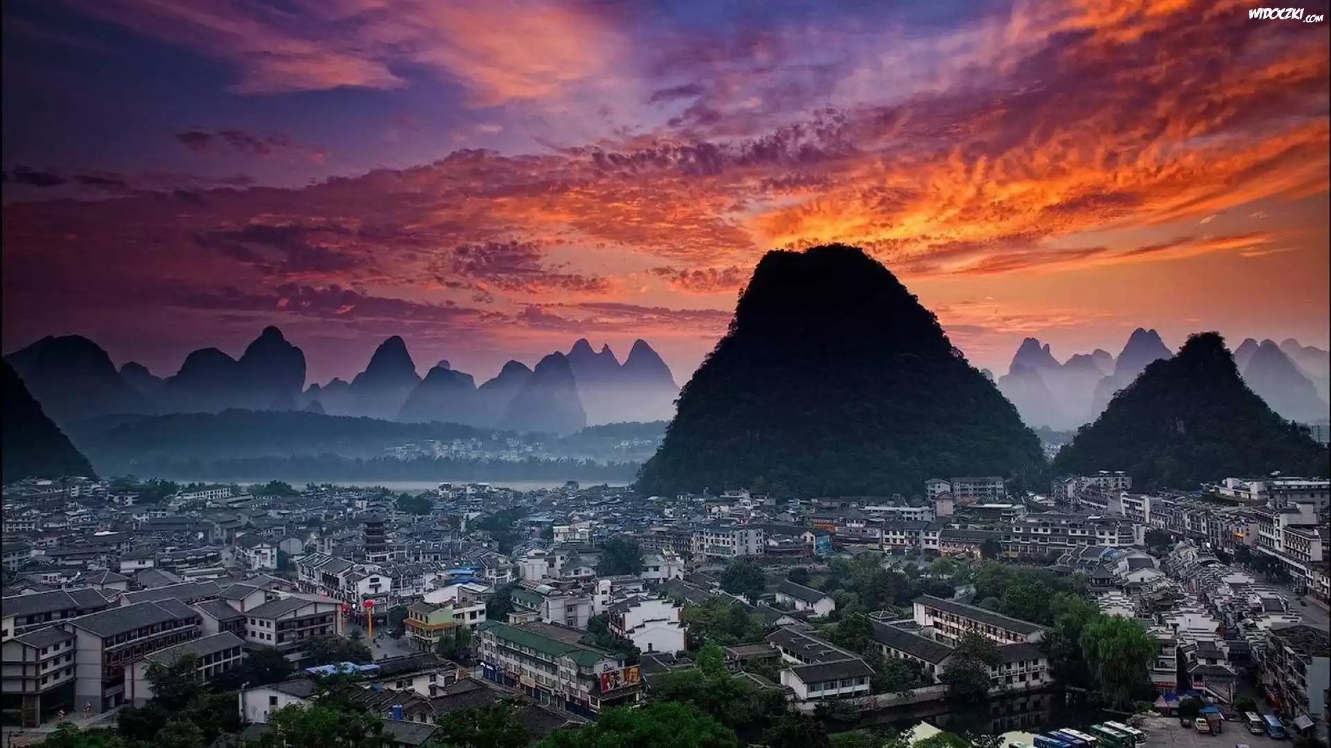 Zdjęcia, Panorama, Miasta, Góry, Mgła, Zachód, Słońca, Wieczór