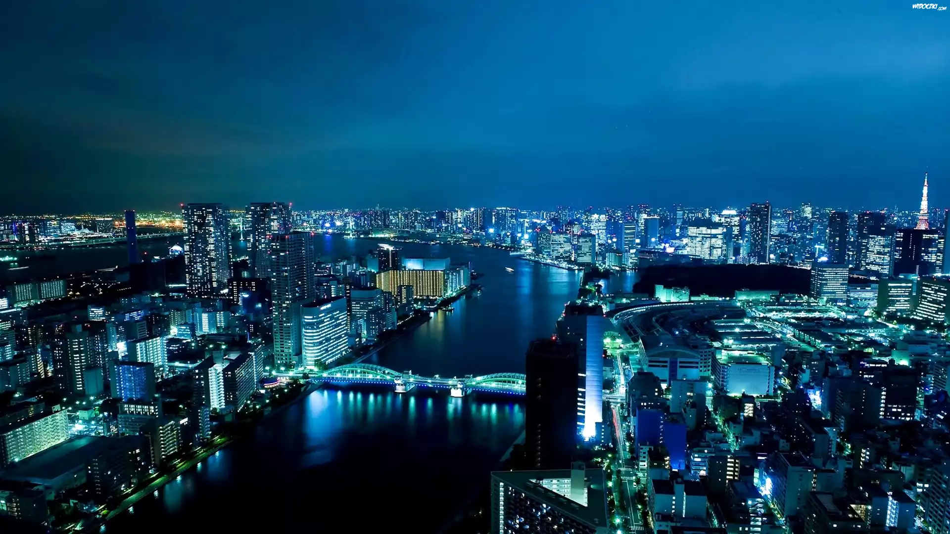 Drapacze, Chmur, Rzeka, Sumida, Most, Tokio, Nocna, Panorama, Miasta