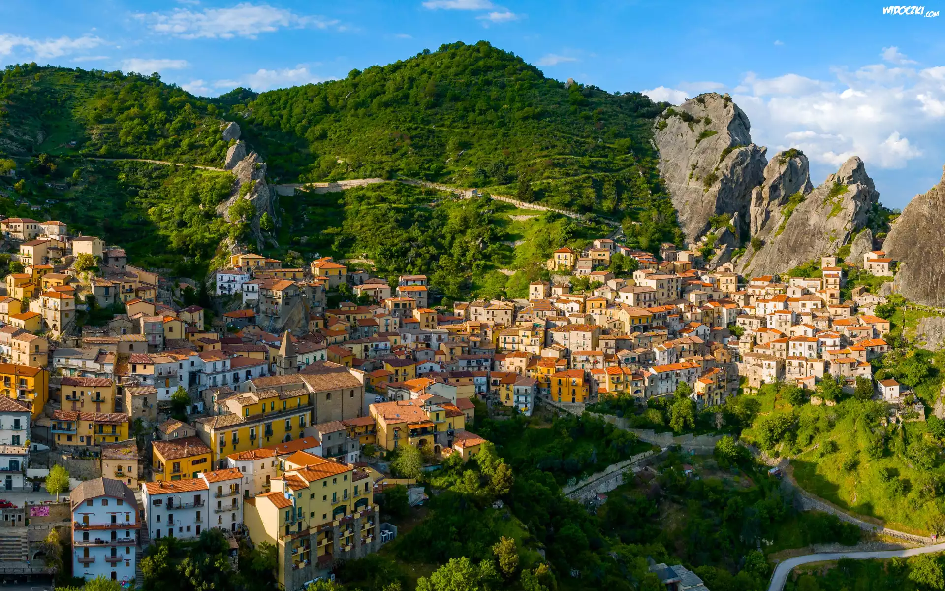 Zdjęcia, Góry, Skały, Drzewa, Miasteczko, Kolorowe, Domy