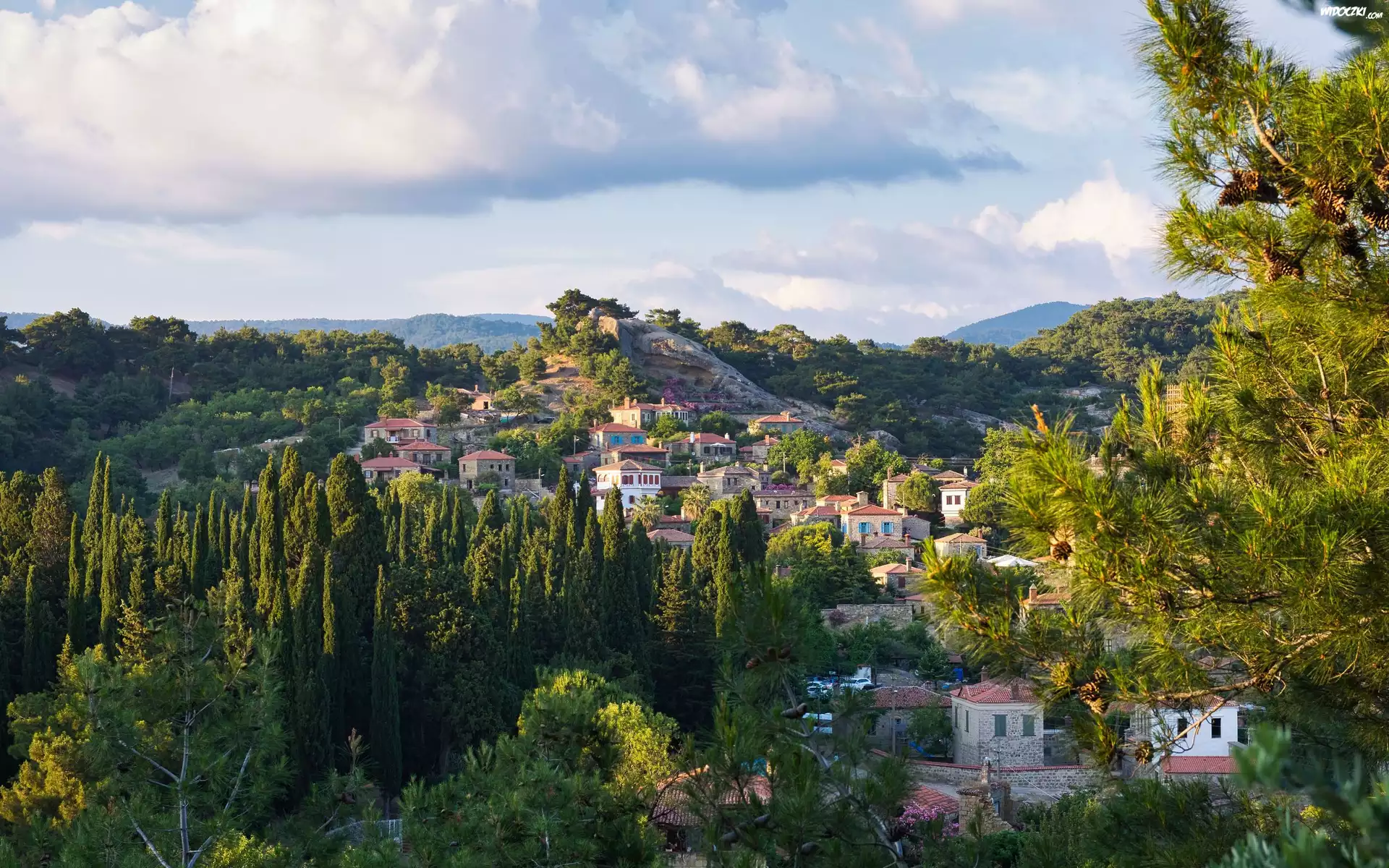 Miasteczko, Góry, Domy, Drzewa, Wzgórza