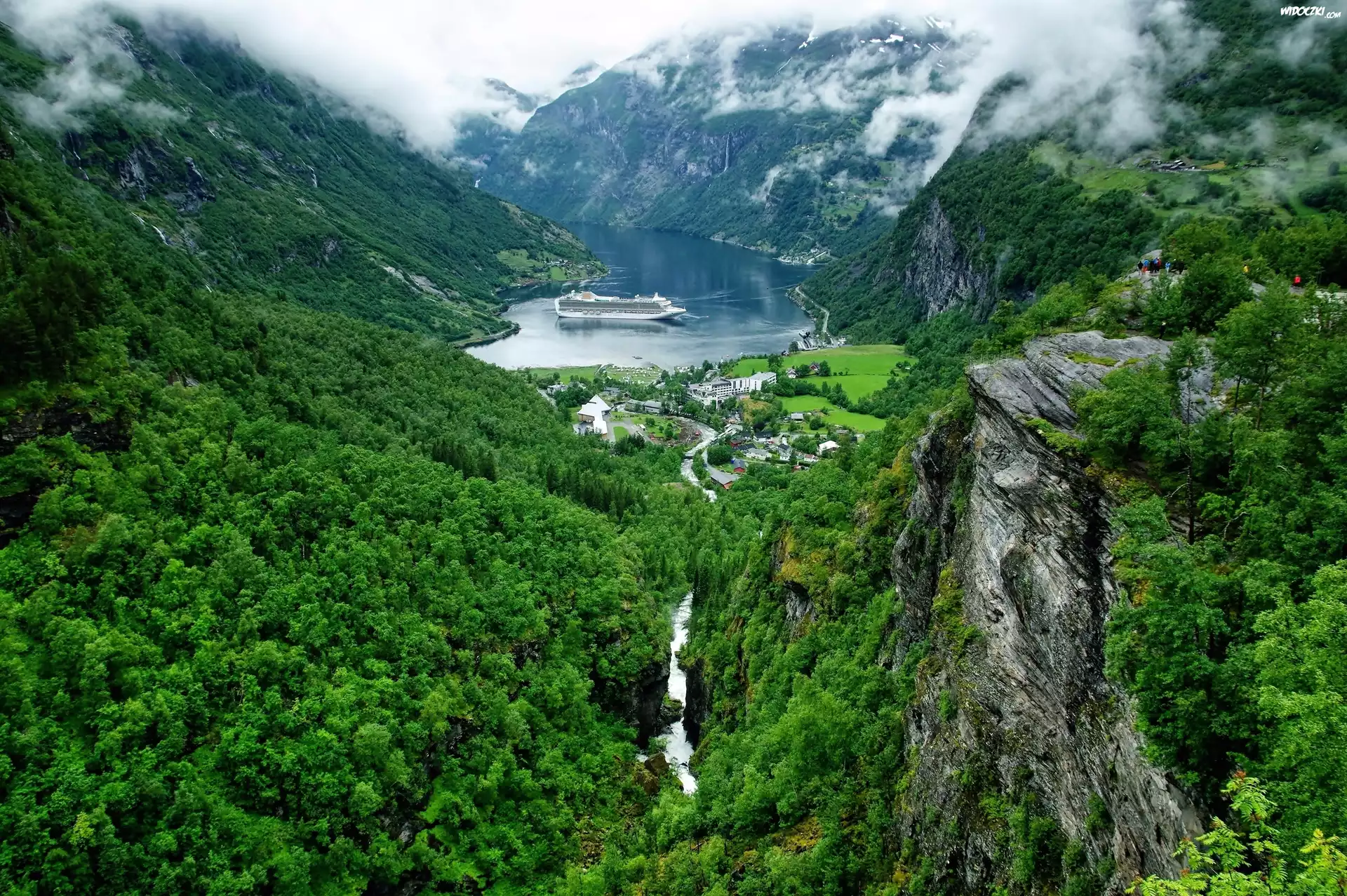 Zdjęcia, Miasteczko, Dolina, Góry, Geirangerfjord, Norwegia, Fiord