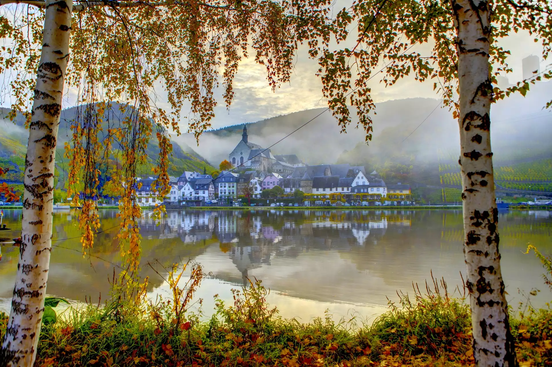 Zdjęcia, Miasteczko, Rzeka, Brzozy, Góry, Mgła