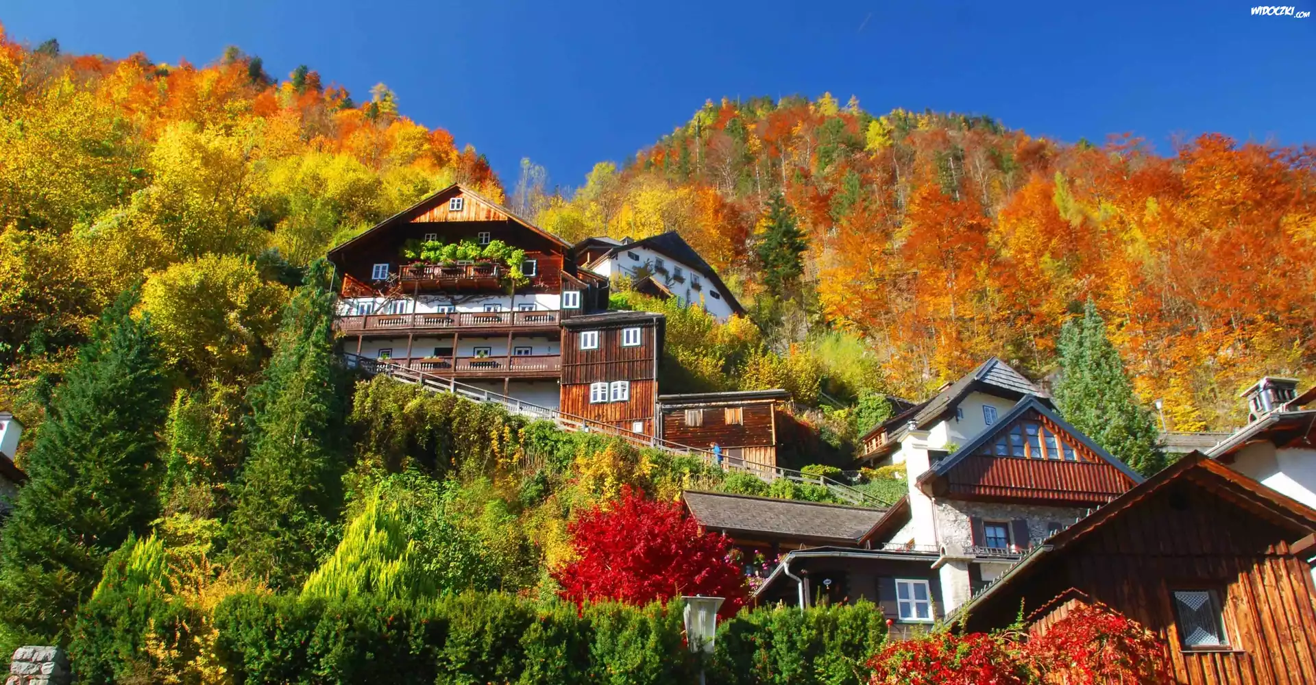 Zdjęcia, Austria, Miasteczko Hallstatt, Domy, Góra, Jesień