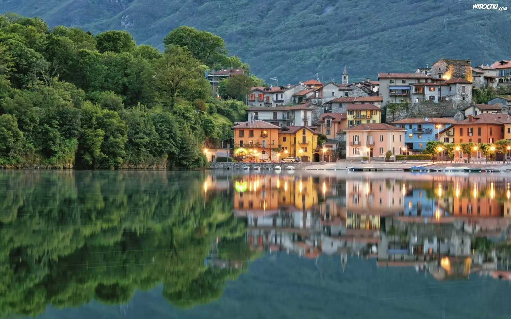 Miasteczko, Mergozzo, Włochy, Morze, Drzewa