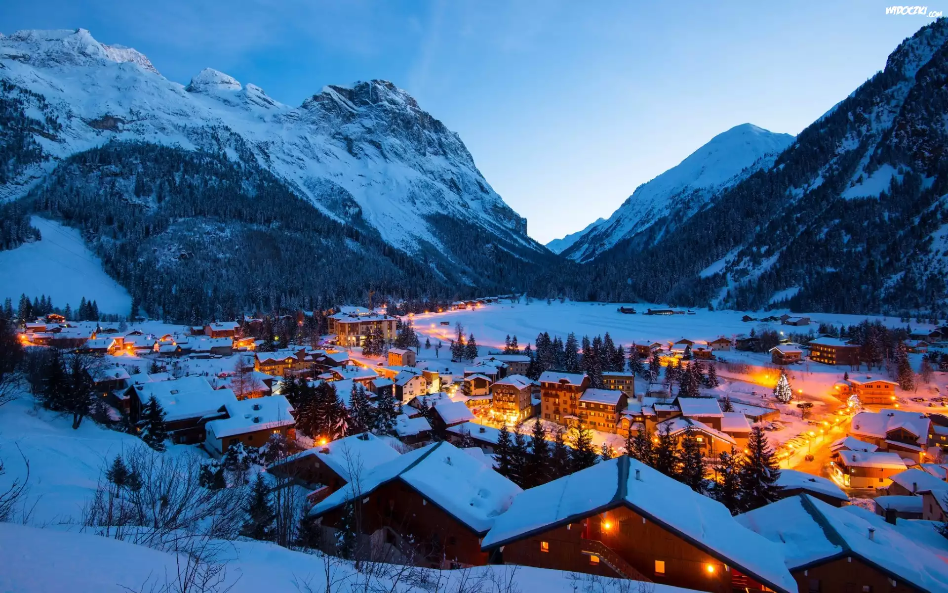 Zdjęcia, Miasteczko, Góry, Lasy, Noc, Zima
