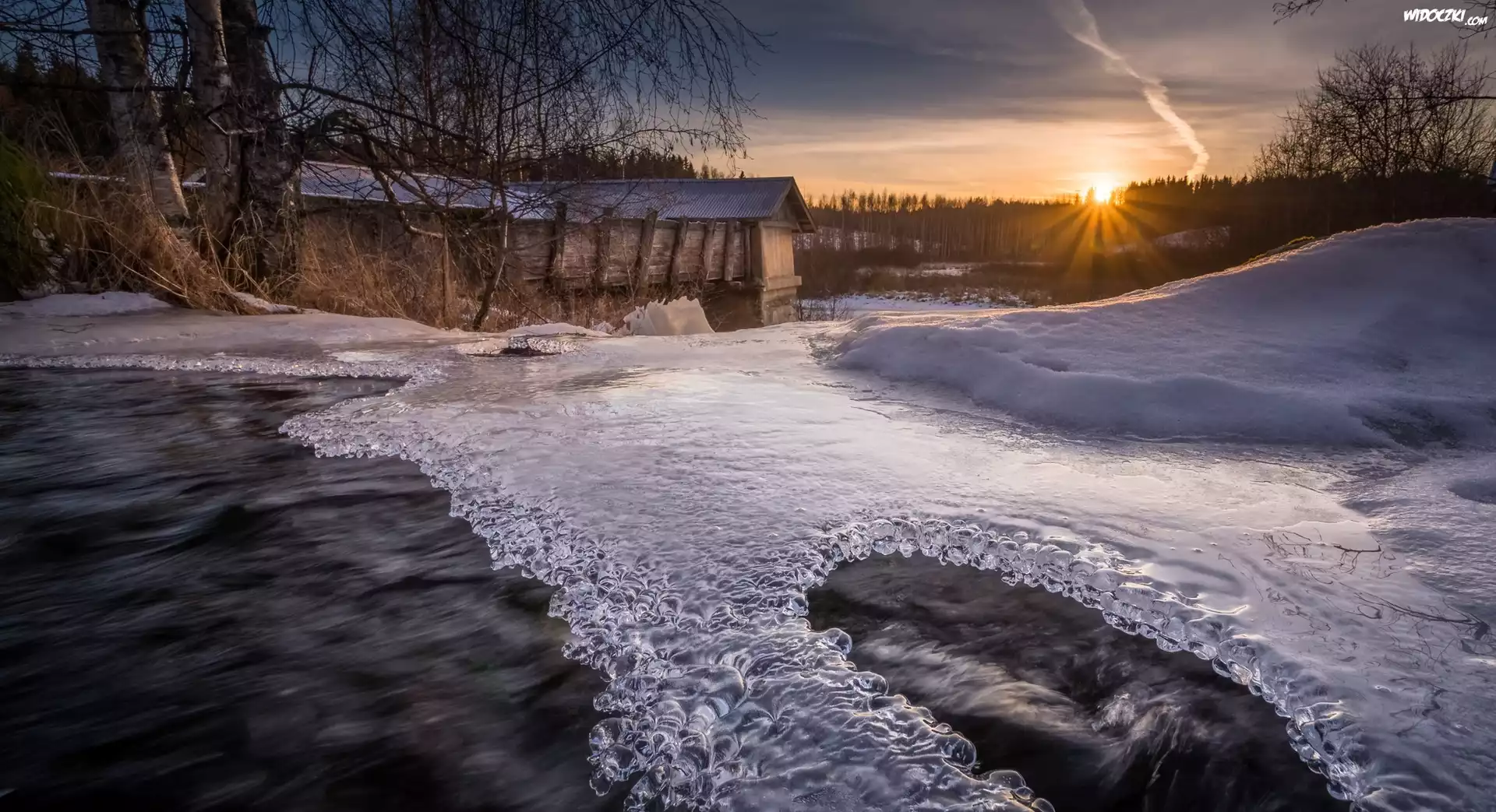 Finlandia, Prowincja Häme, Miasto Tampere, Rzeka Kiimajoki, Stary Młyn, Zima, Drzewa, Promienie słońca |