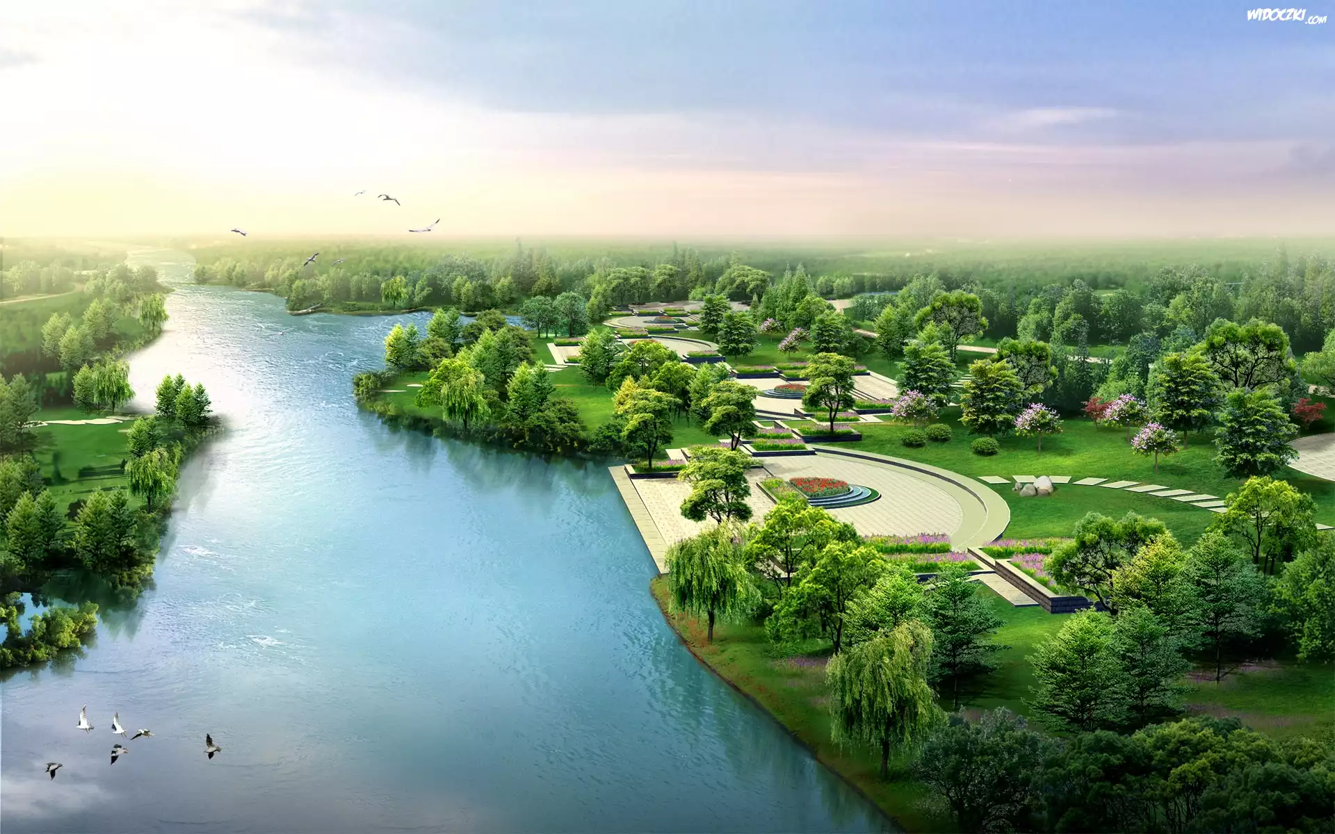 Zdjęcia, Grafika, Miasto, Las, Rzeka, Z lotu ptaka