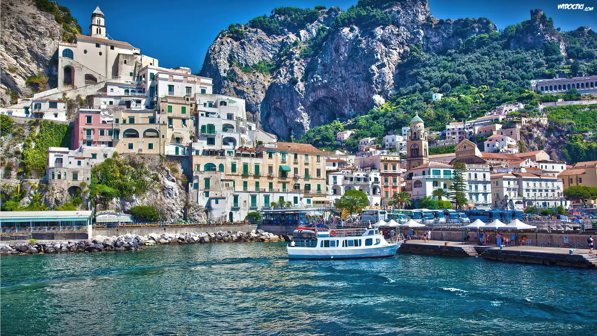 Miasto, Amalfi, Łódź, Morze, Góry