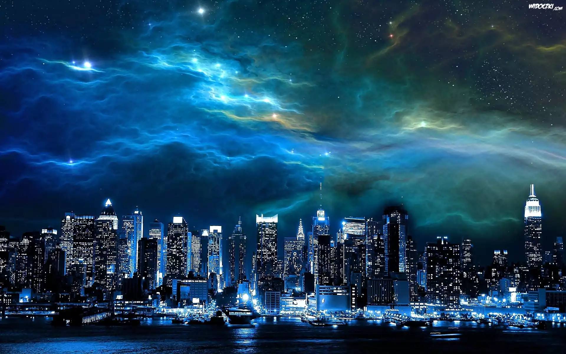 Zdjęcia, Miasto, Nocą, Drapacze Chmur, Niebo, Chmury