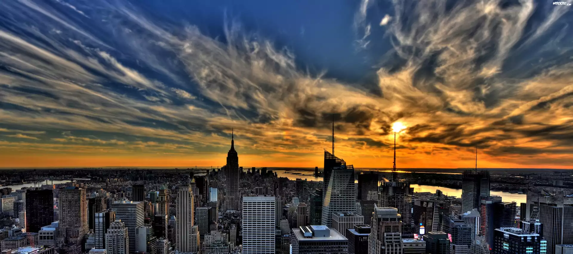 Miasto, Budynki, Zachód, Słońca, Niebo, Chmury