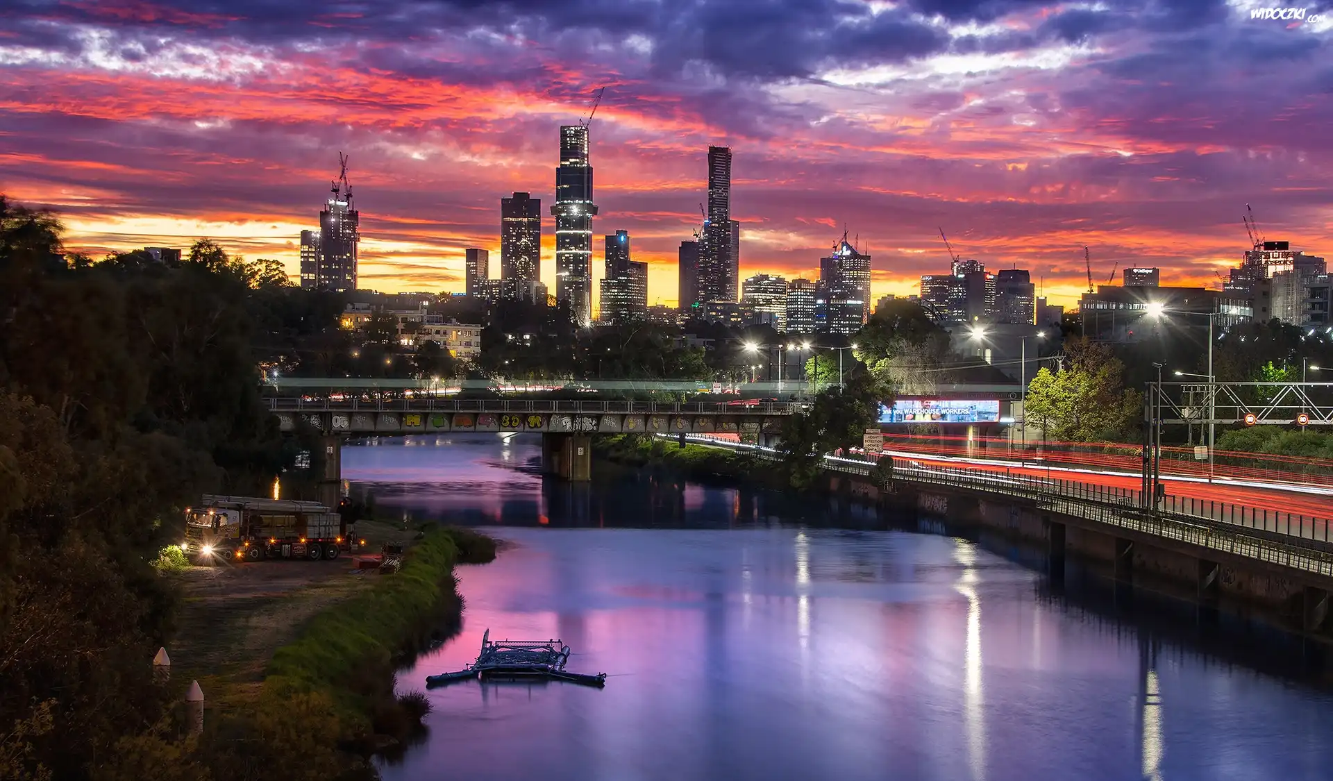 Zdjęcia, Australia, Melbourne, Miasto, Wieżowce, Rzeka Yarra, Most, Światła, Chmury, Zachód słońca