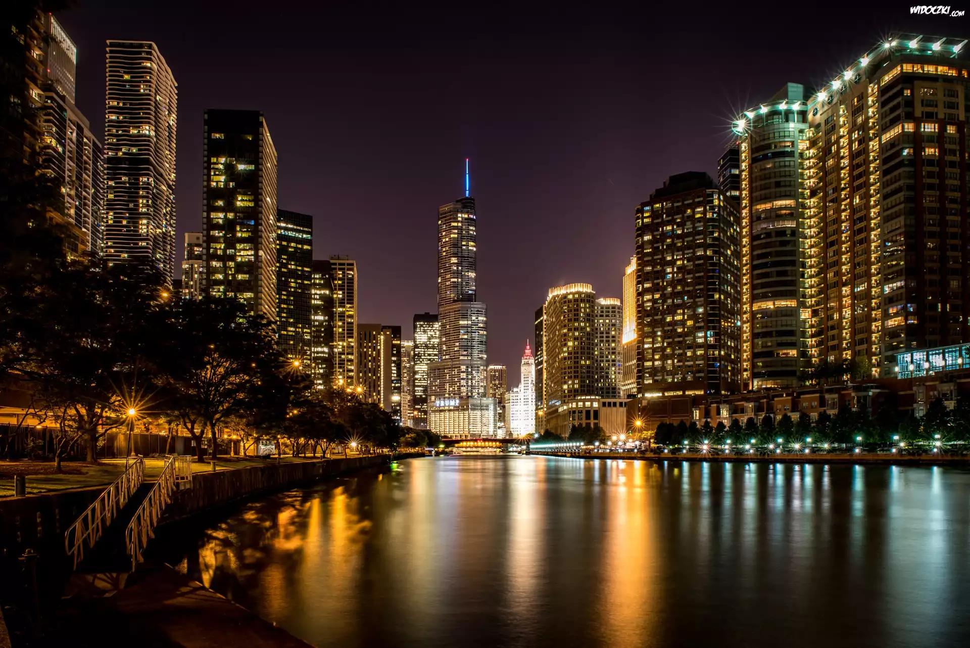 Zdjęcia, Stany Zjednoczone, Stan Illinois, Chicago, Miasto nocą, Rzeka Chicago, Wieżowce, Willis Tower