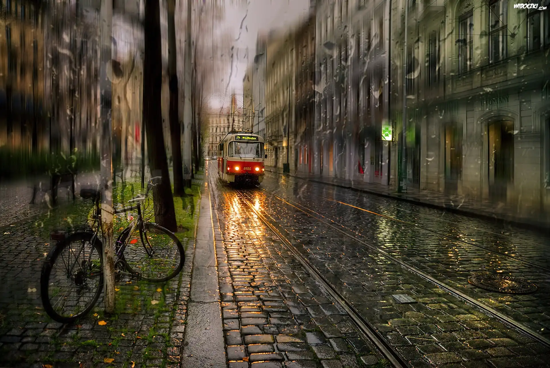 Miasto, Wieczór, Tramwaj, Rower, Ulica, Tory