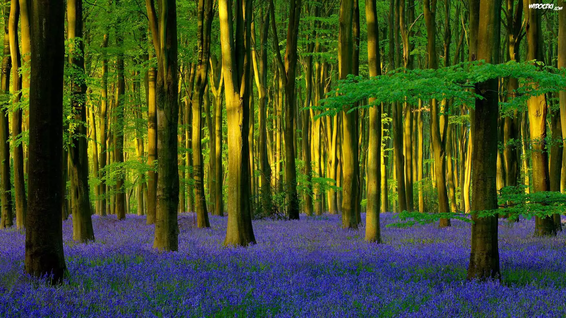 Anglia, Hrabstwo Hampshire, Wieś Micheldever, Las, Micheldever Wood, Drzewa, Kwiaty, Hiacyntowiec zwyczajny, Światło słoneczne |