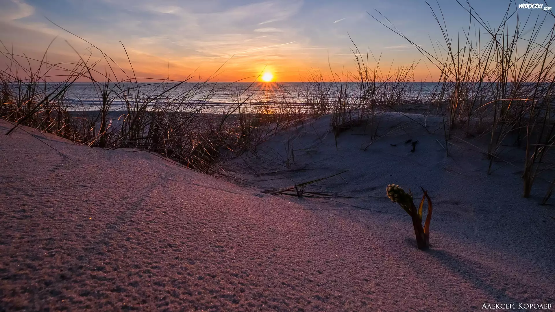 Morze Bałtyk, Mierzeja Kurońska, Piasek, Trawy, Zachód słońca, Obwód kaliningradzki, Rosja