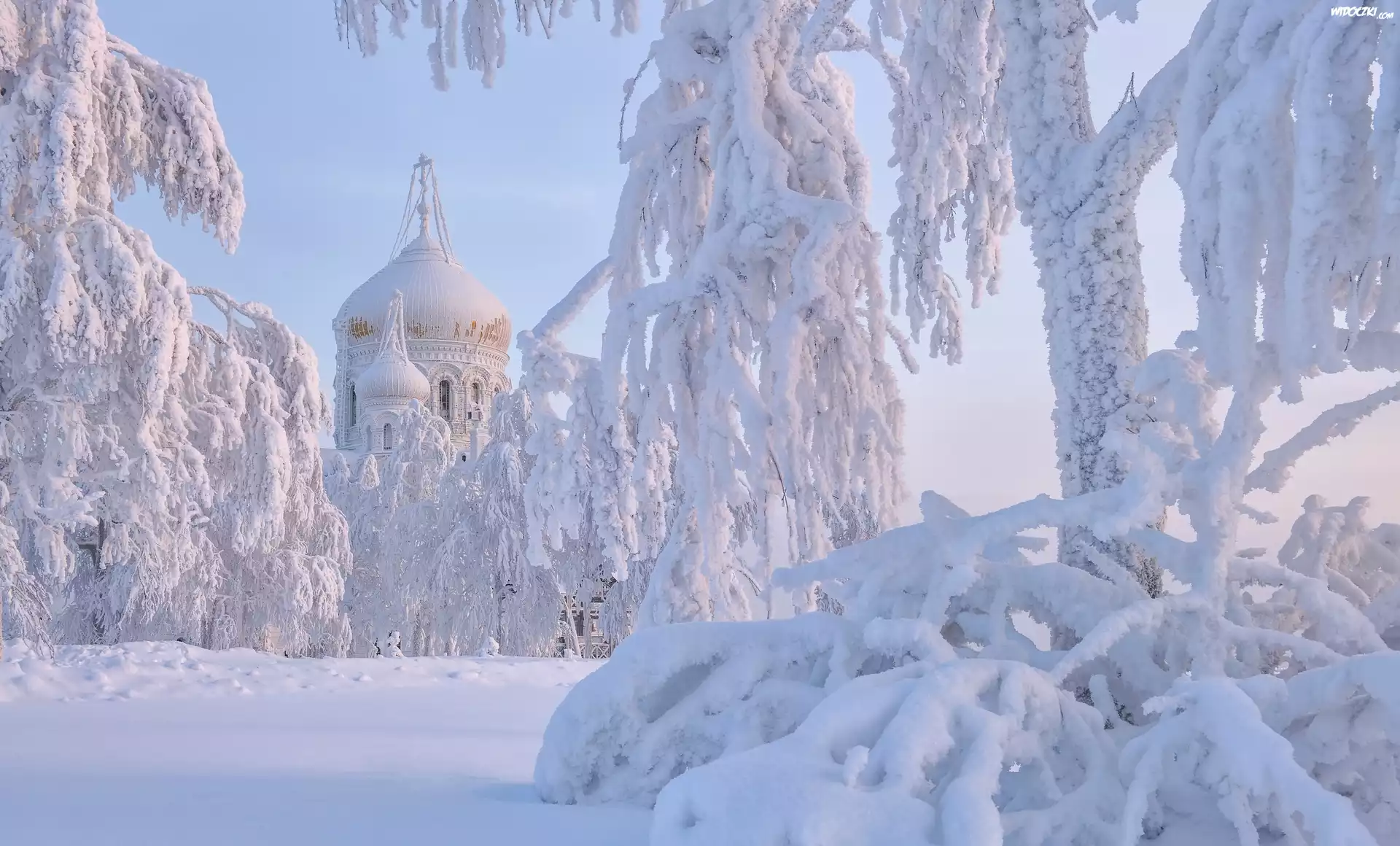 Cerkiew, Białogórski Monaster św Mikołaja, Zima, Śnieg, Ośnieżone, Drzewa, Biała Góra, Obwód permski, Rosja |