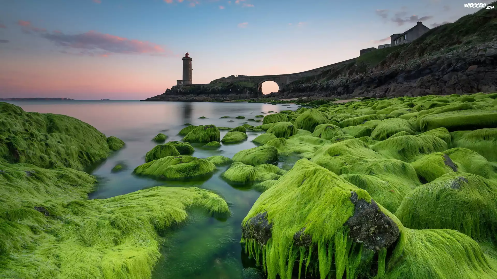 Zdjęcia, Latarnia morska Phare du Petit Minou, Plouzane, Francja, Most, Morze, Wodorosty, Kamienie