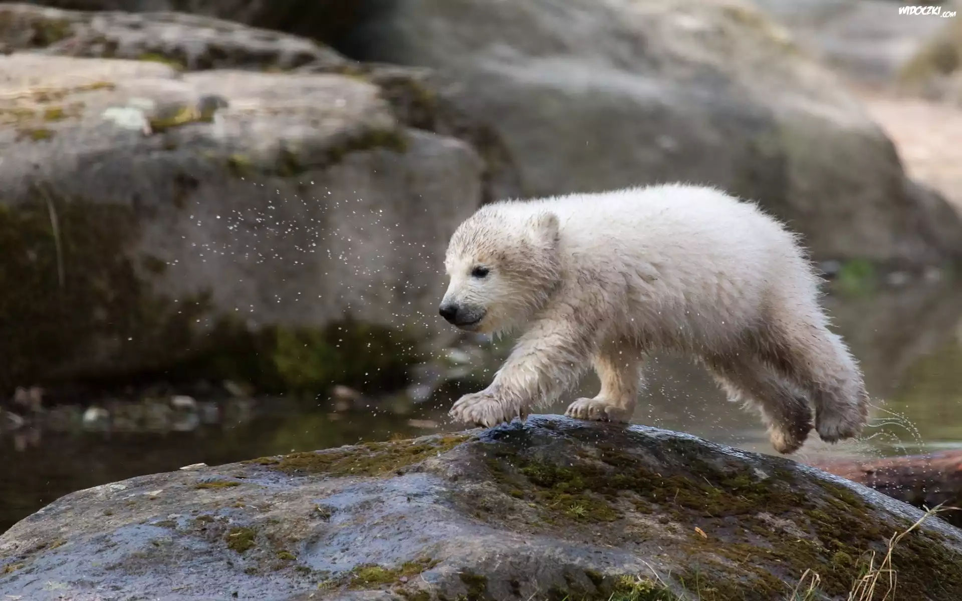 Zdjęcia, Młody, Niedźwiadek, Polarny, Skały, Woda