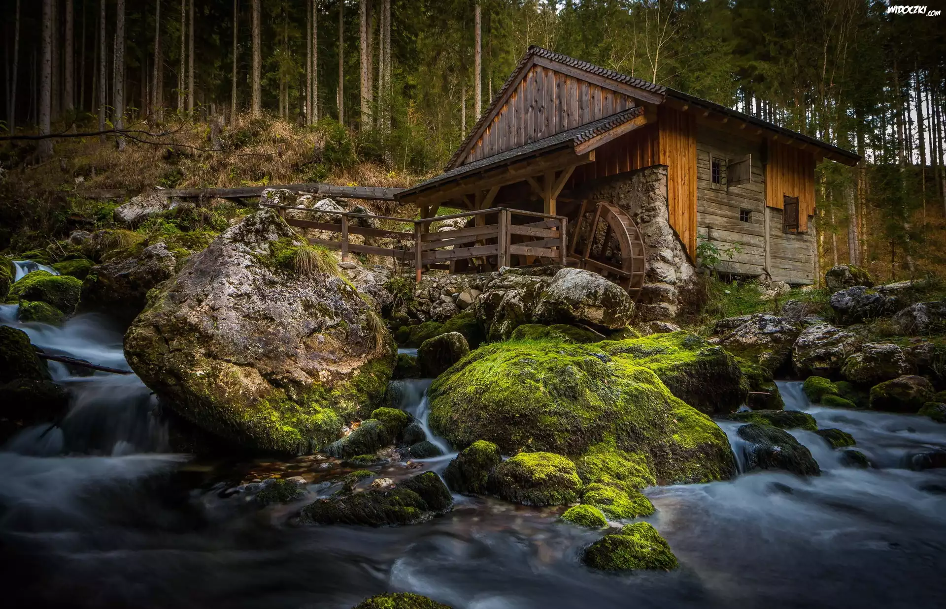 Młyn wodny, Las, Drzewa, Rzeka, Omszałe, Kamienie