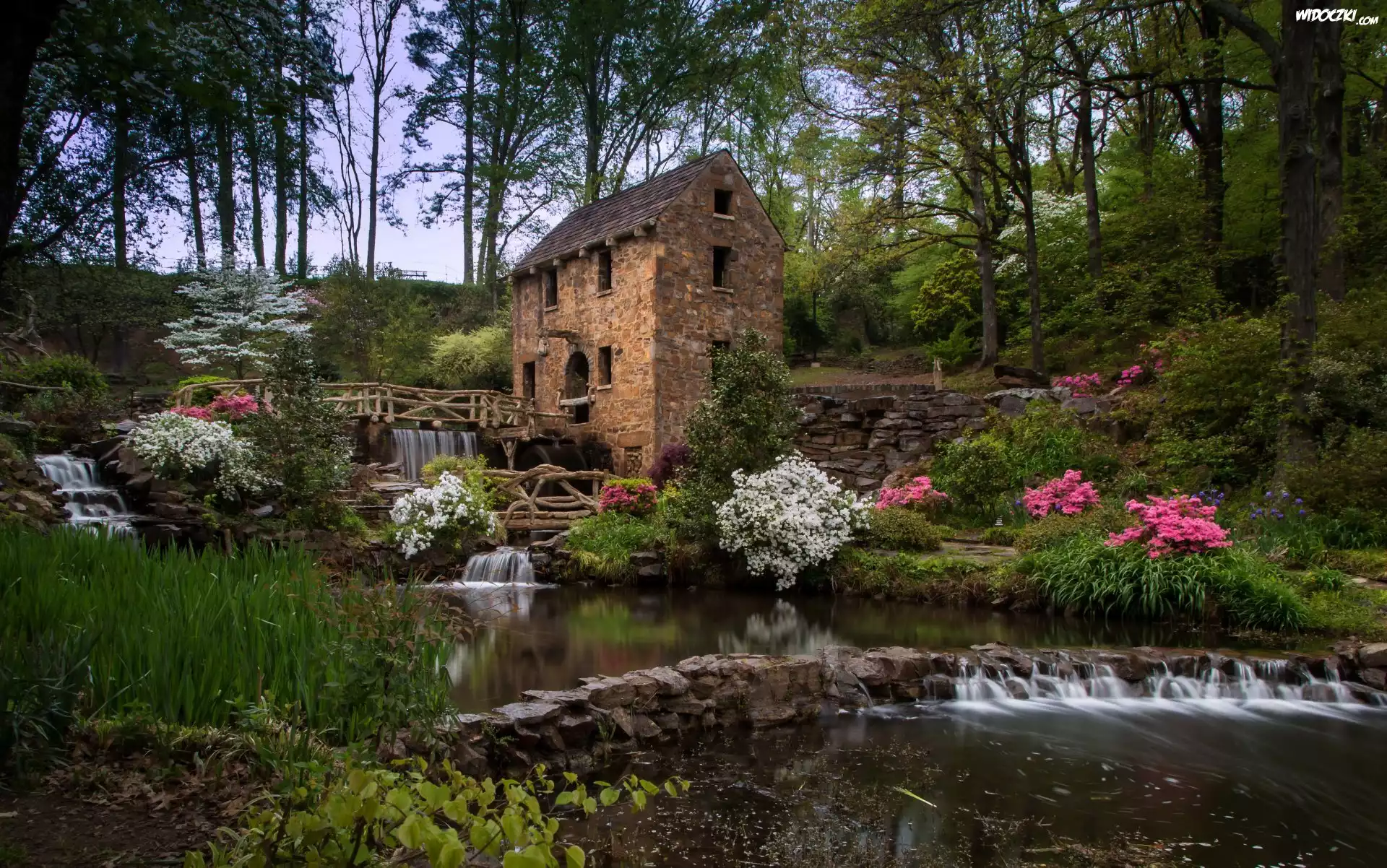 Młyn, Rzeka, Wodospad, Drzewa, Krzewy, Rabaty