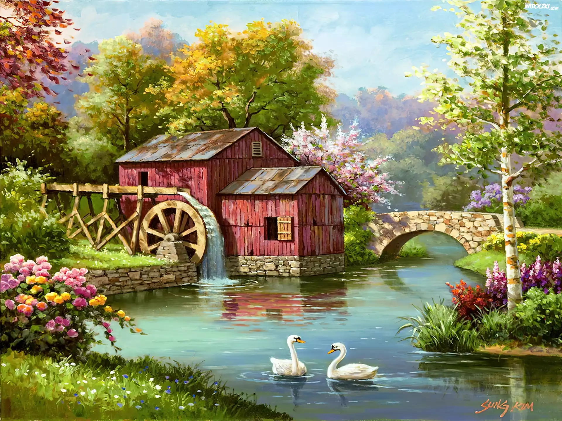 Zdjęcia, Młyn, Łabędzie, Rzeka, Most