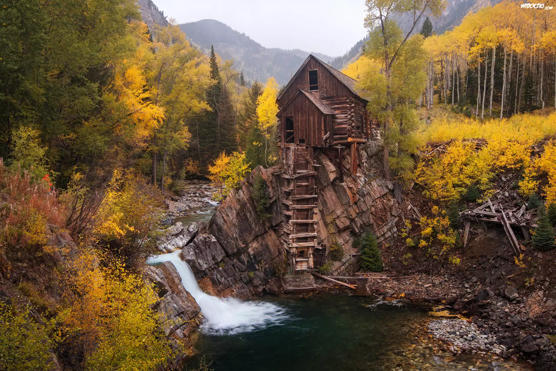 Młyn Crystal Mill, Kryształowy Młyn, Las, Drzewa, Góry, Rzeka Crystal River, Jesień, Stan Kolorado, Stany Zjednoczone |