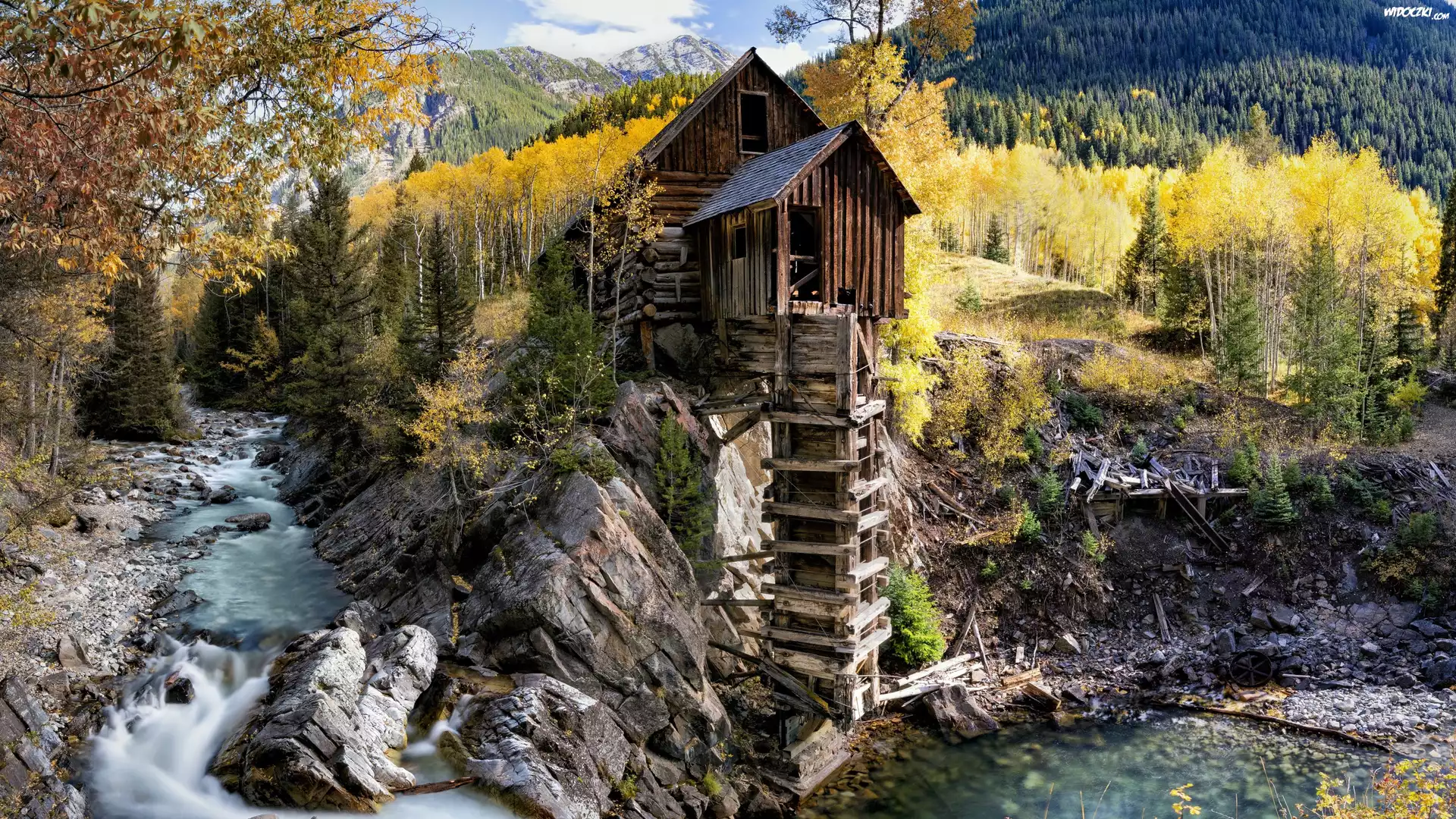 Zdjęcia, Stany Zjednoczone, Stan Kolorado, Jesień, Młyn Crystal Mill, Rzeka Crystal River, Skały