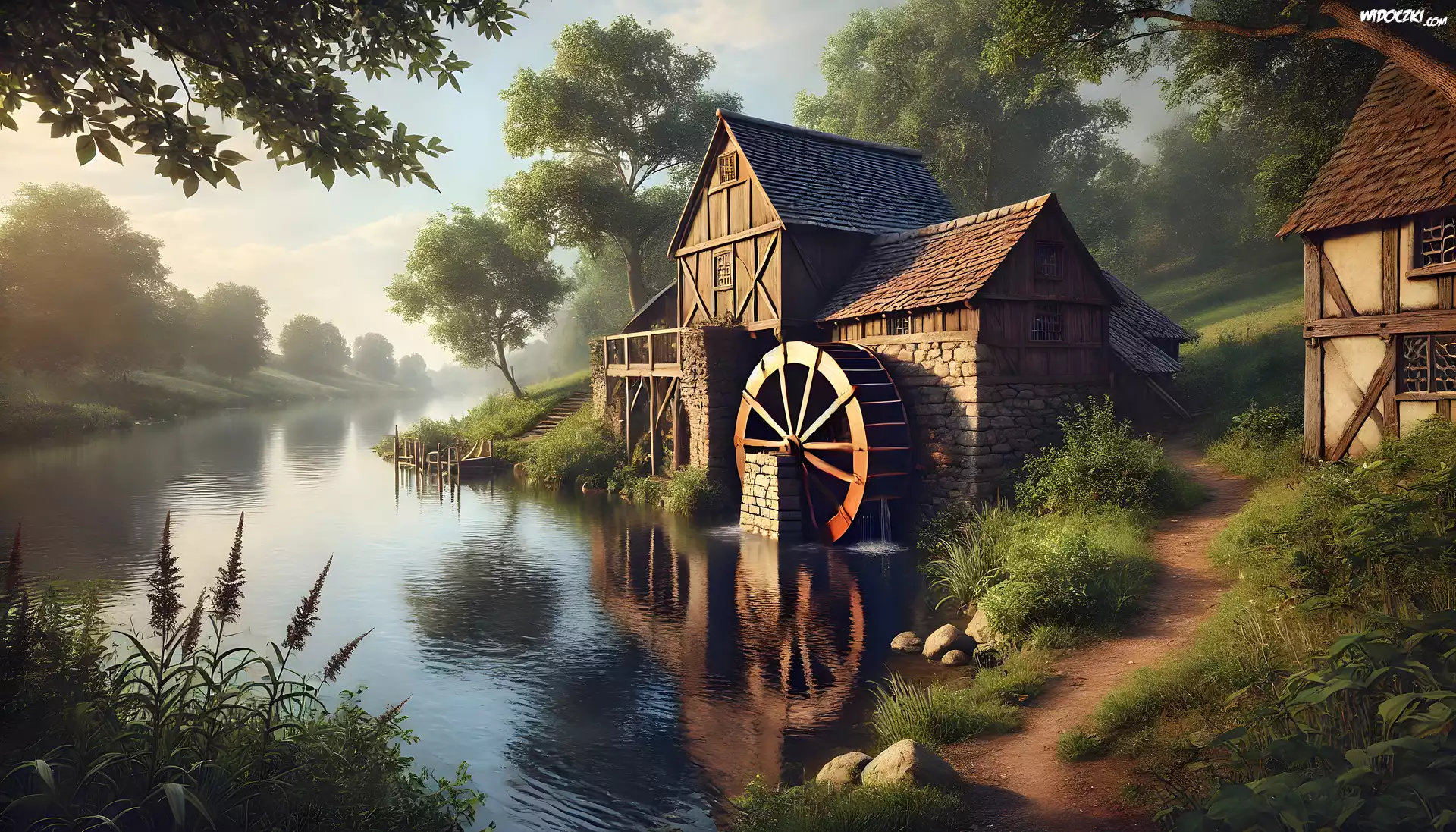 Zdjęcia, Rzeka, Młyn wodny, Drzewa, Grafika