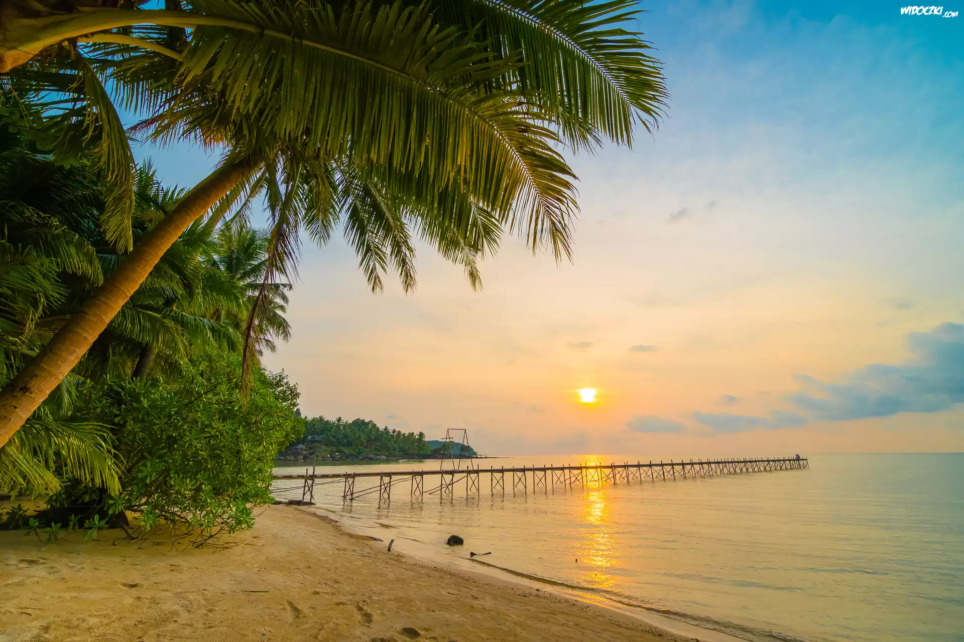 Zdjęcia, Plaża, Palmy, Drzewa, Molo, Morze, Zachód słońca