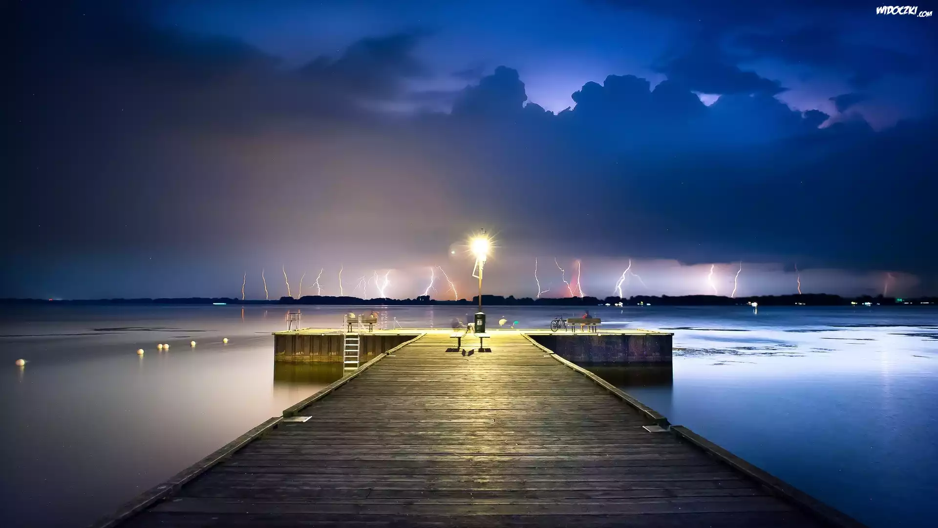 Zdjęcia, Morze, Molo, Burza, Pioruny, Chmury, Noc, Lato