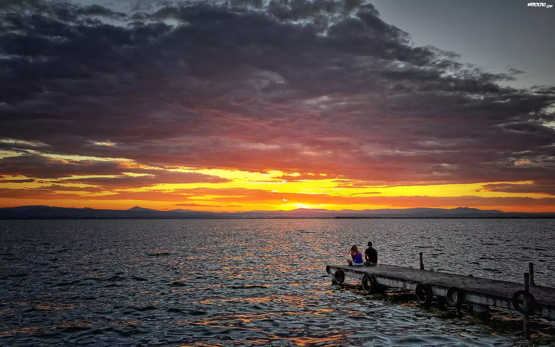 Jezioro, Molo, Kobieta, Mężczyzna, Góry, Chmury, Zachód, Słońca