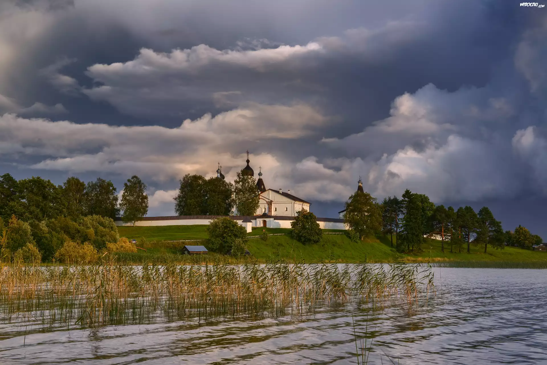 Jezioro, Szuwary, Drzewa, Chmury, Klasztor, Monaster Terapontowski, Wieś Ferapontovo, Obwód wołogodzki, Rosja |