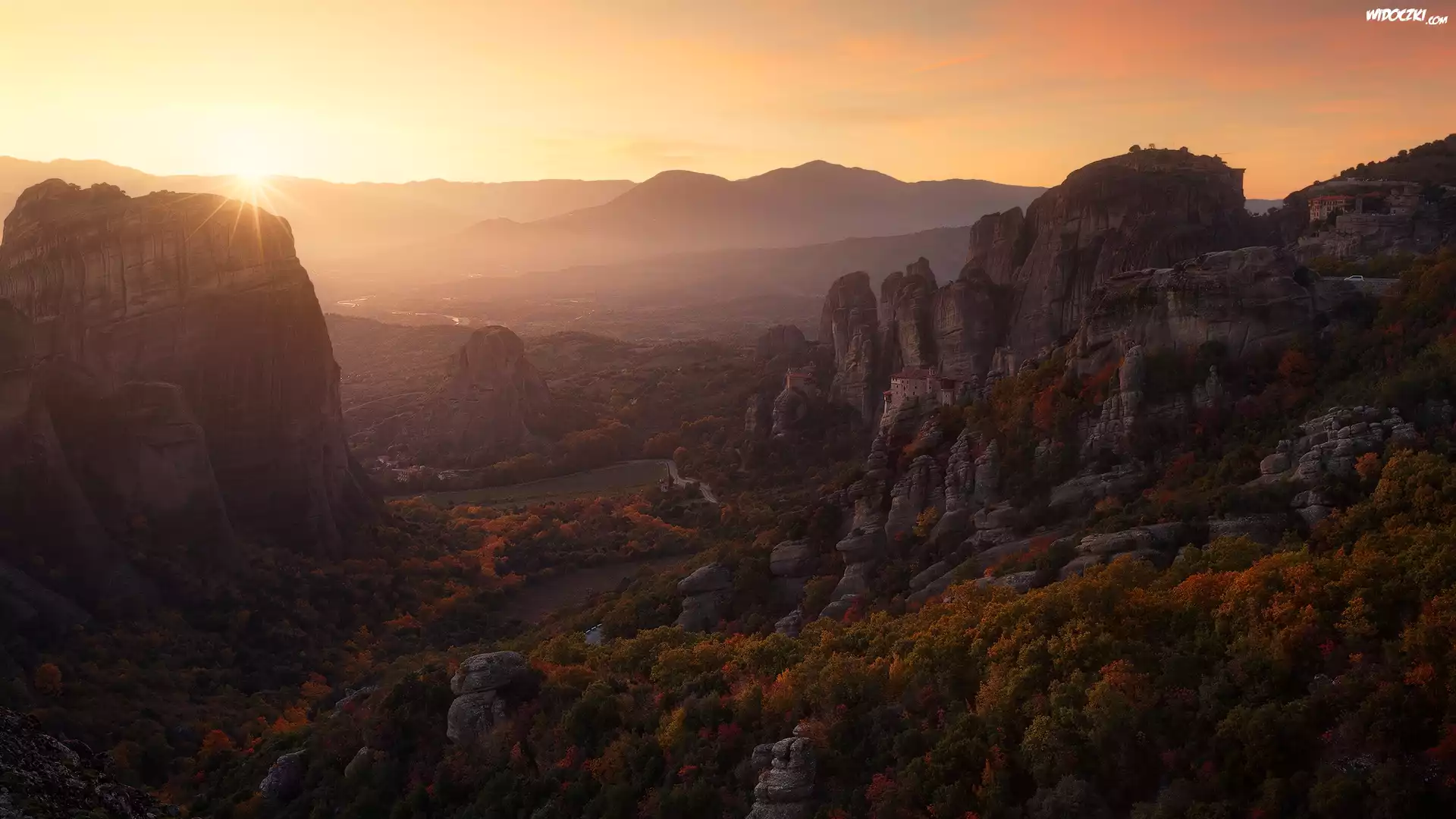 Grecja, Góry, Masyw skalny, Meteory, Monastyr Varlaam, Klasztor Warłama, Zachód słońca, Skały