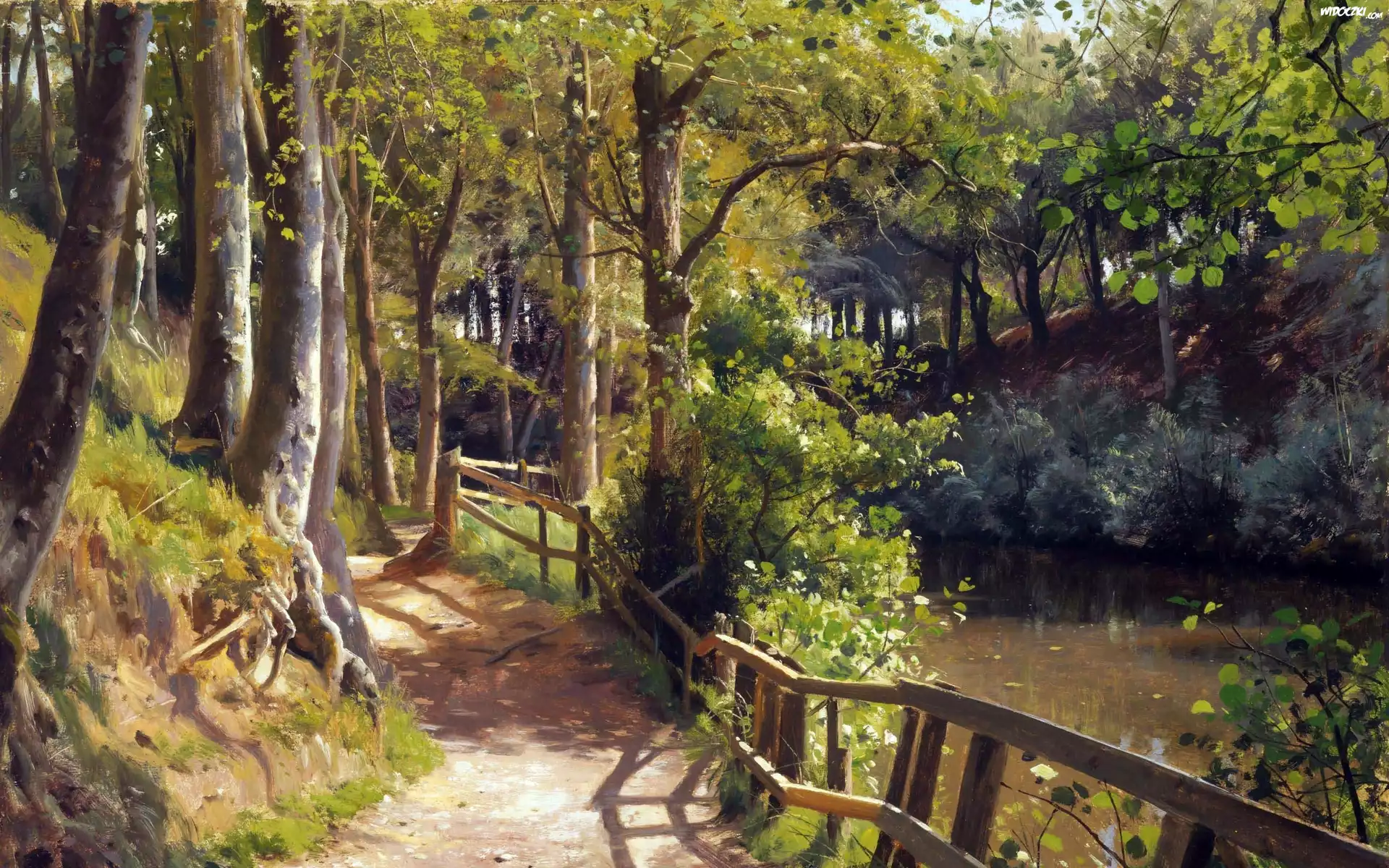 Zdjęcia, Malarstwo, Obraz, Droga, Las, Drzewa, Ogrodzenie, Rzeka, Peder Mork Monsted