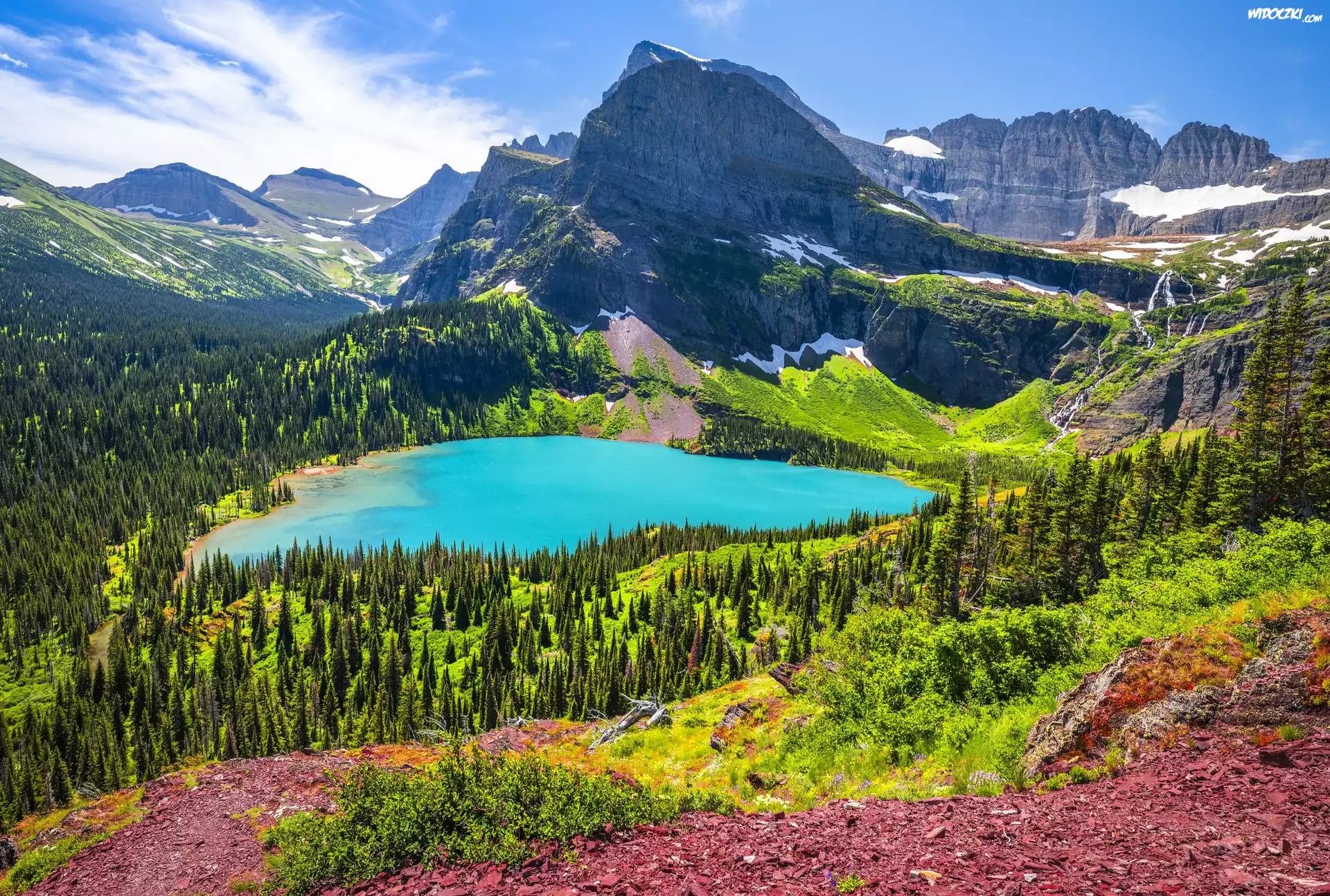 Zdjęcia, Park Narodowy Glacier, Jezioro, Grinnell Lake, Góry, Lasy, Niebo, Montana, Stany Zjednoczone