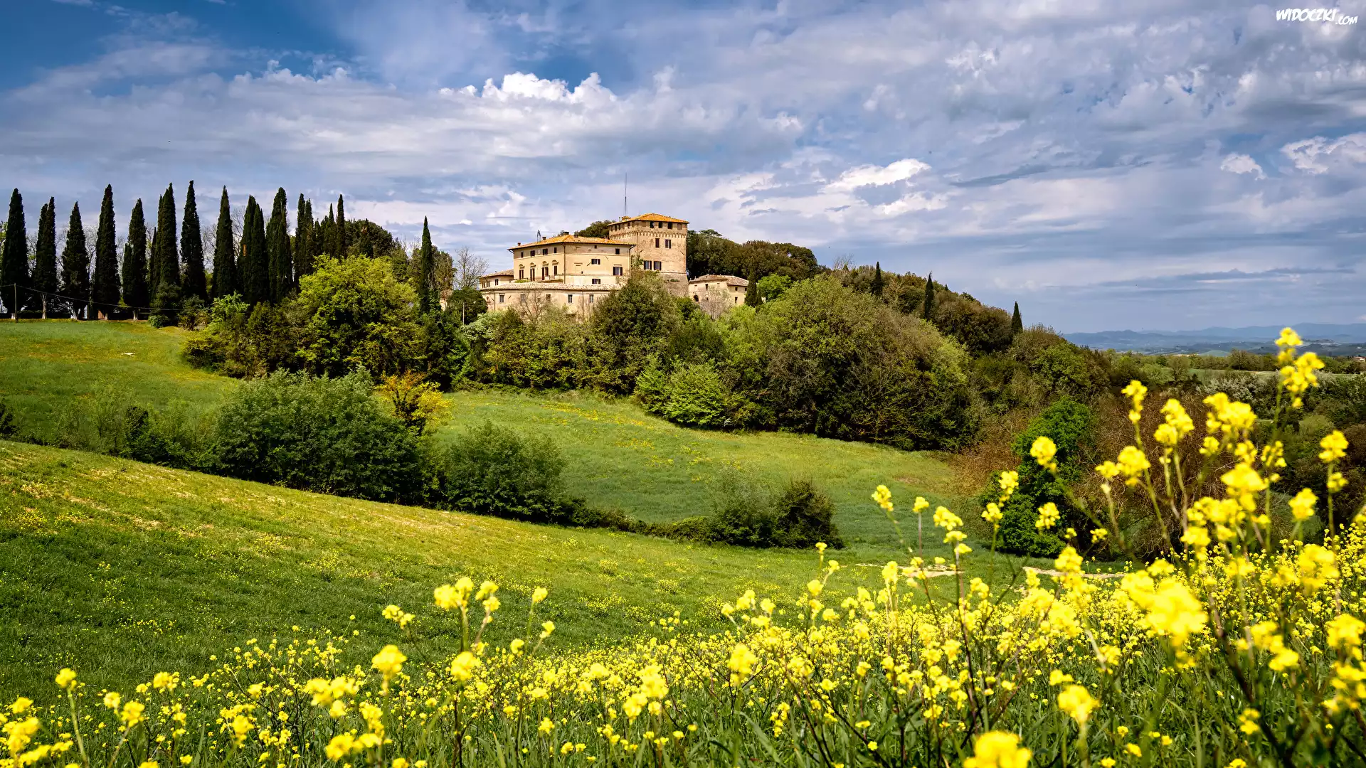 Zdjęcia, Włochy, Toskania, Prowincja Siena, Toskania, Villa Montesoli, Łąka, Kwiaty, Drzewa, Wzgórza
