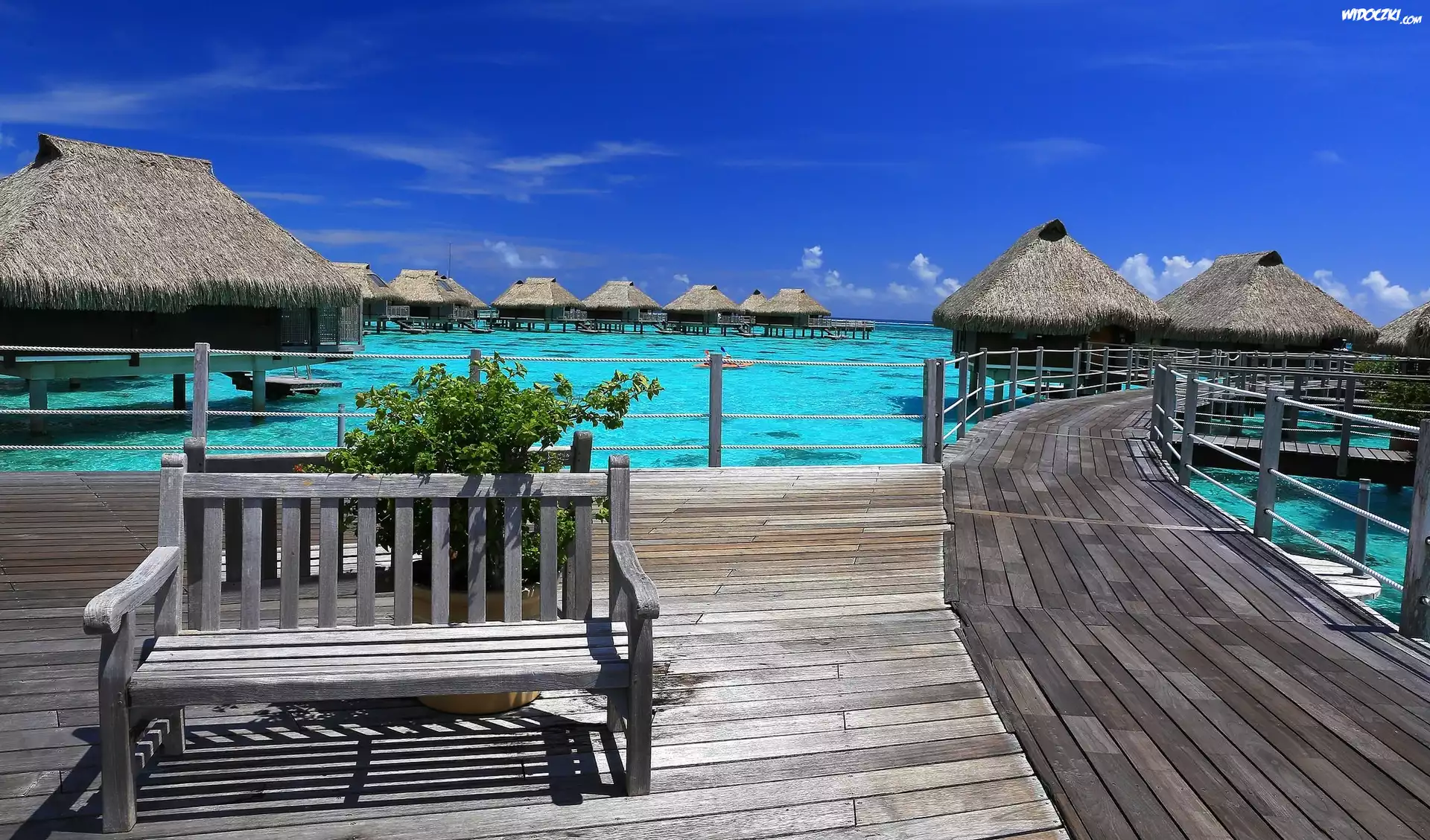 Zdjęcia, Wyspa, Moorea, Kurort, Ławka, Ocean, Domki, Bungalow
