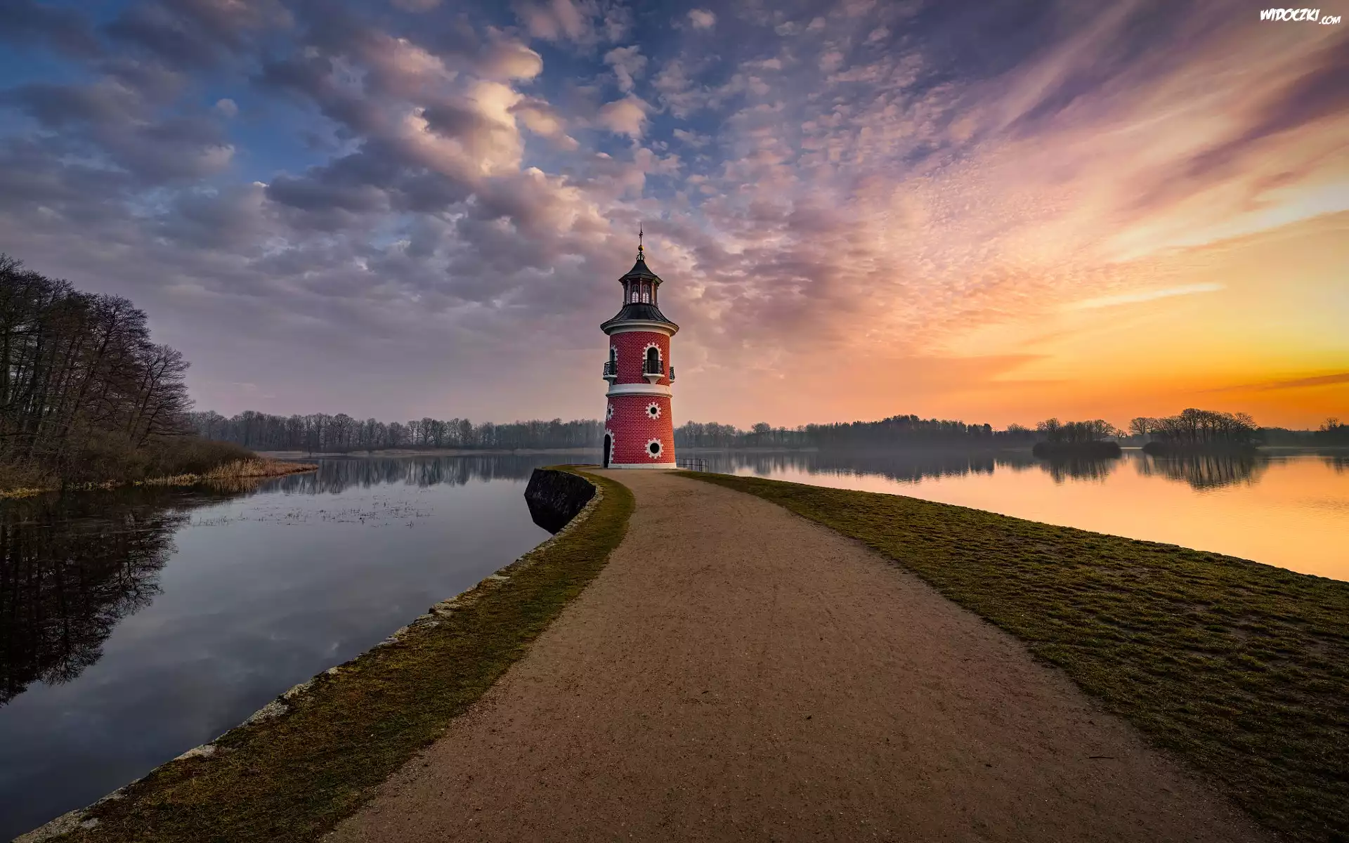 Wschód słońca, Drzewa, Jezioro, Latarnia, Leuchtturm Moritzburg, Chmury, Moritzburg, Saksonia, Niemcy |