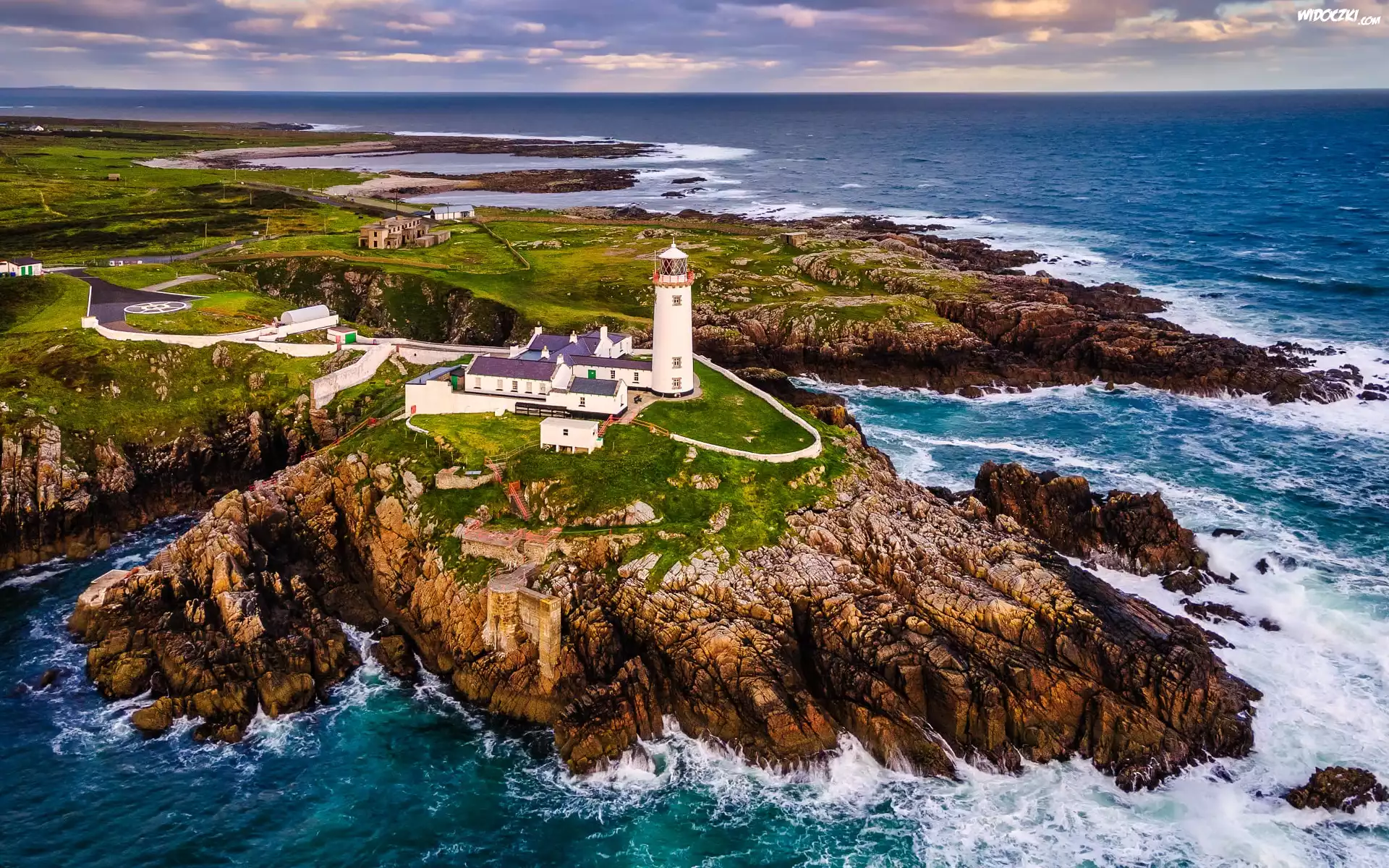 Zdjęcia, Morze, Latarnia morska, Fanad Head Lighthouse, Skały, Chmury, Portsalon, Irlandia Północna