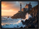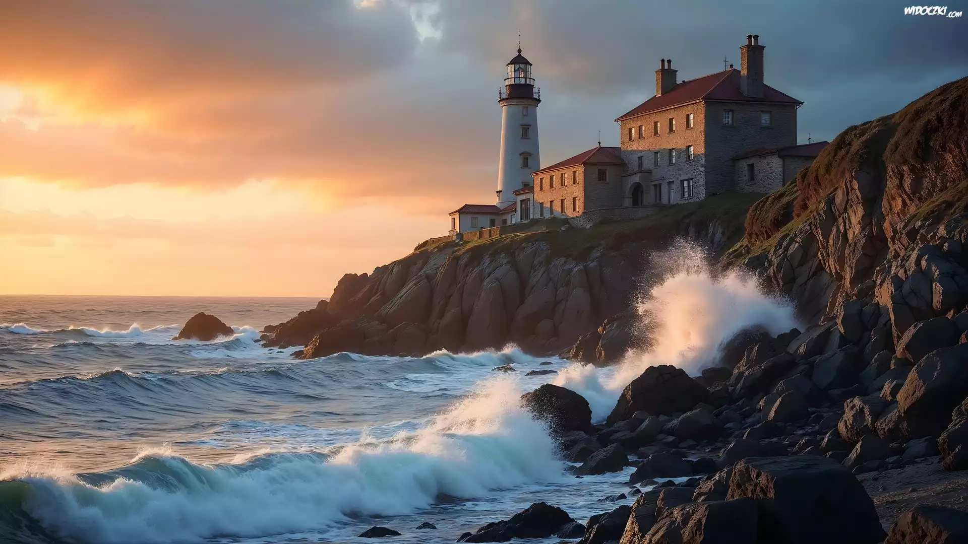 Zdjęcia, Morze, Fale, Latarnia morska, Skały, Zachód słońca