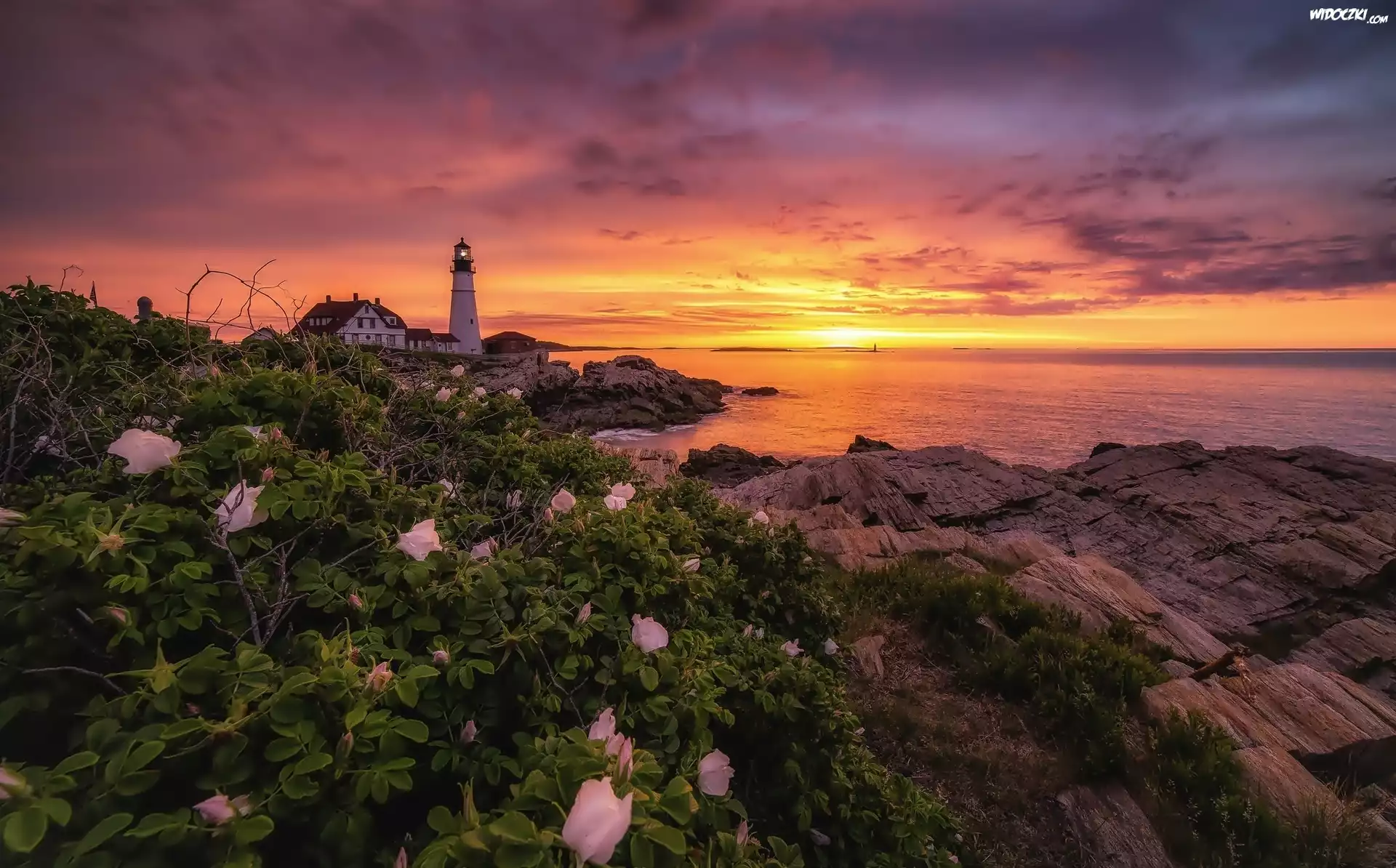 Zdjęcia, Latarnia Morska, Morze, Skały, Zachód Słońca, Kwiaty
