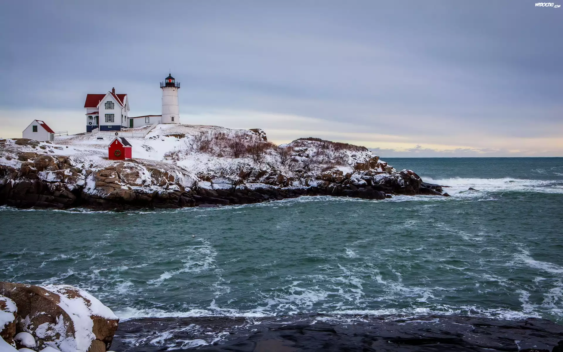 Zdjęcia, Latarnia, Morska, Domy, Skały, Morze, Fale, Zima