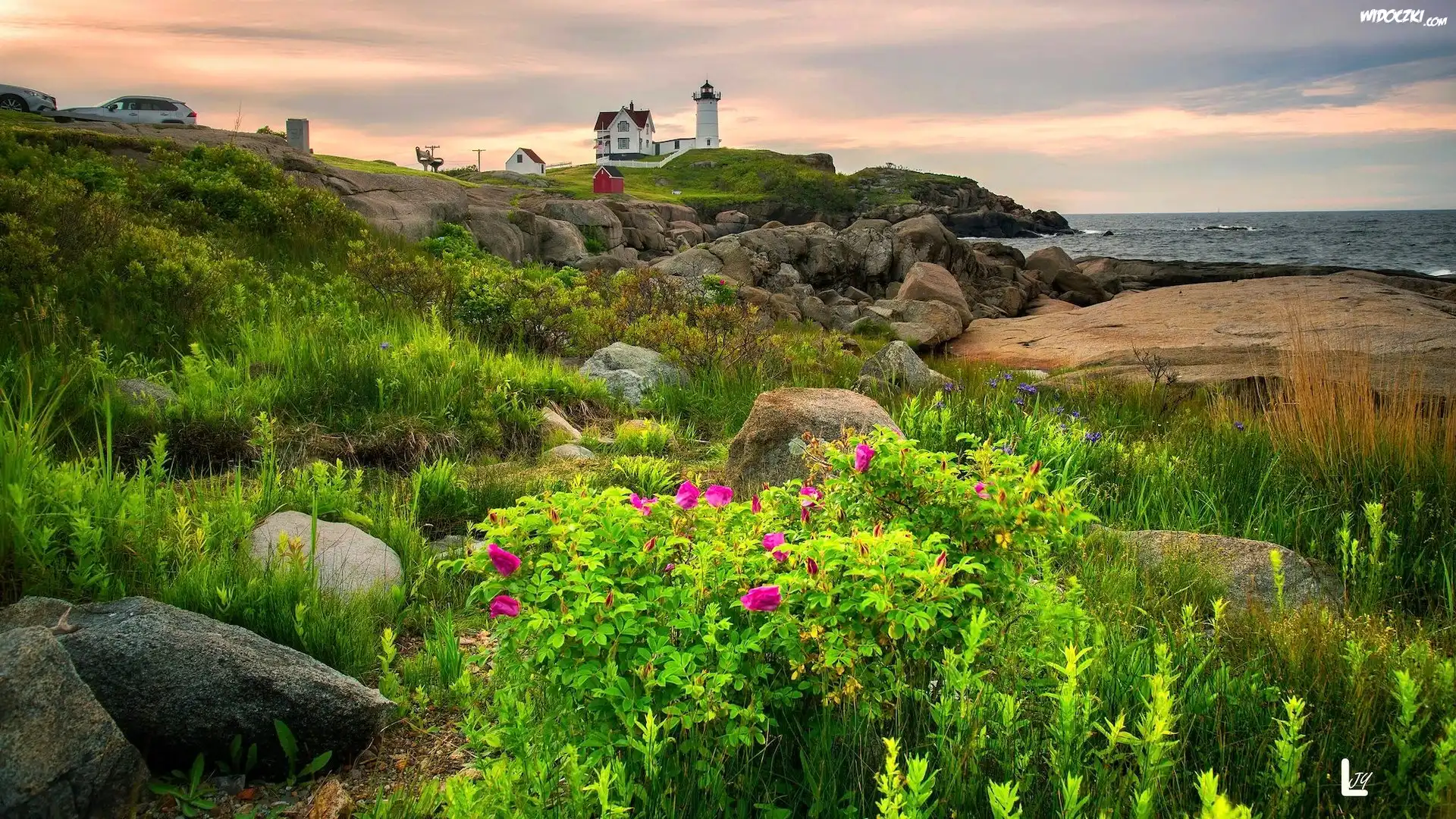 Morze, Wybrzeże, Latarnia morska, Nubble Lighthouse, Skały, Rośliny, Cape Neddick, Maine, Stany Zjednoczone |