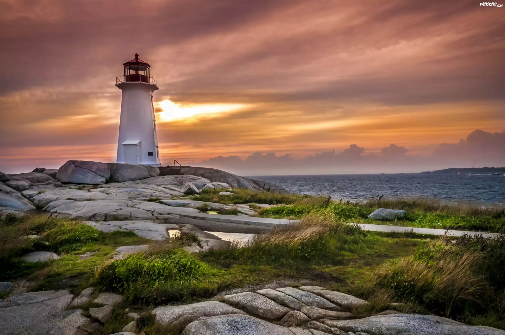 Zdjęcia, Kanada, Latarnia morska: Peggys Point Lighthouse, Kamienie, Skały, Trawa, Morze, Chmury